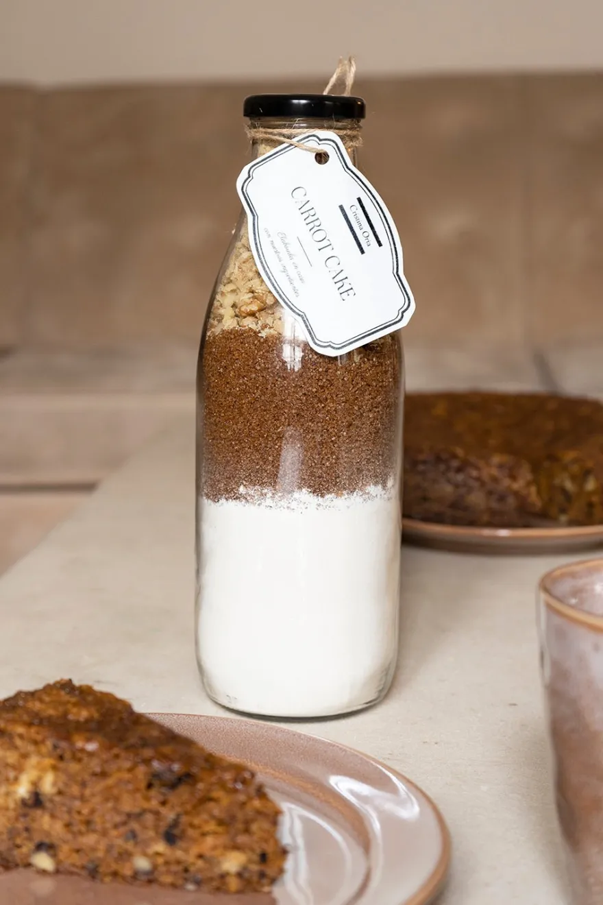 Botella de cristal rellena de los ingredientes sólidos para elaborar en casa una deliciosa tarta de zanahoria al estilo CO.
