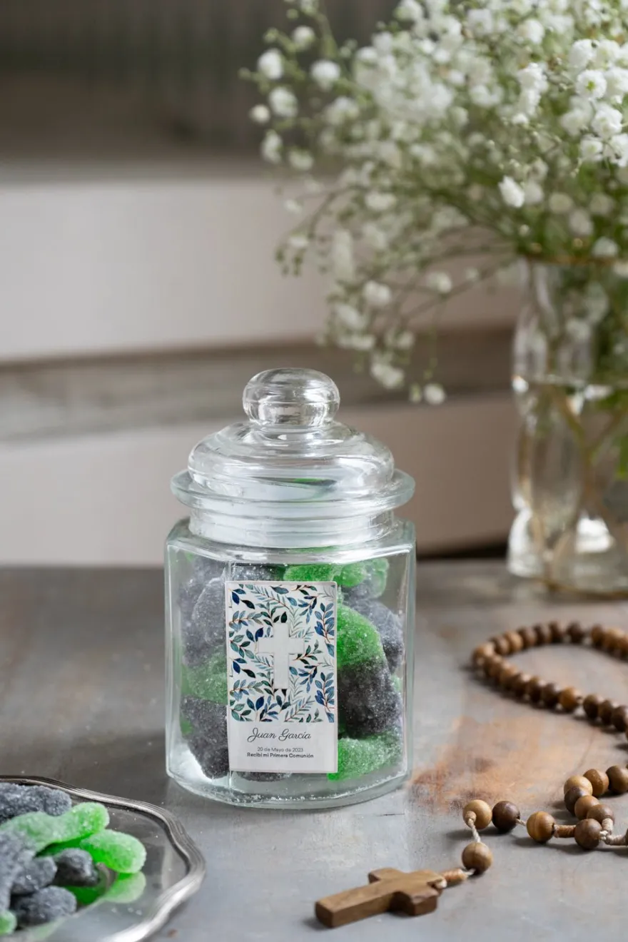Regala a tus invitados unas golosinas de coca cola sin gluten en tarro de cristal hexagonal personalizado con un recordatorio con el nombre y fecha de la primera comunión.