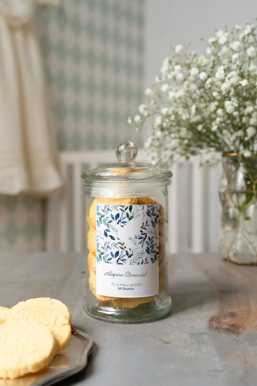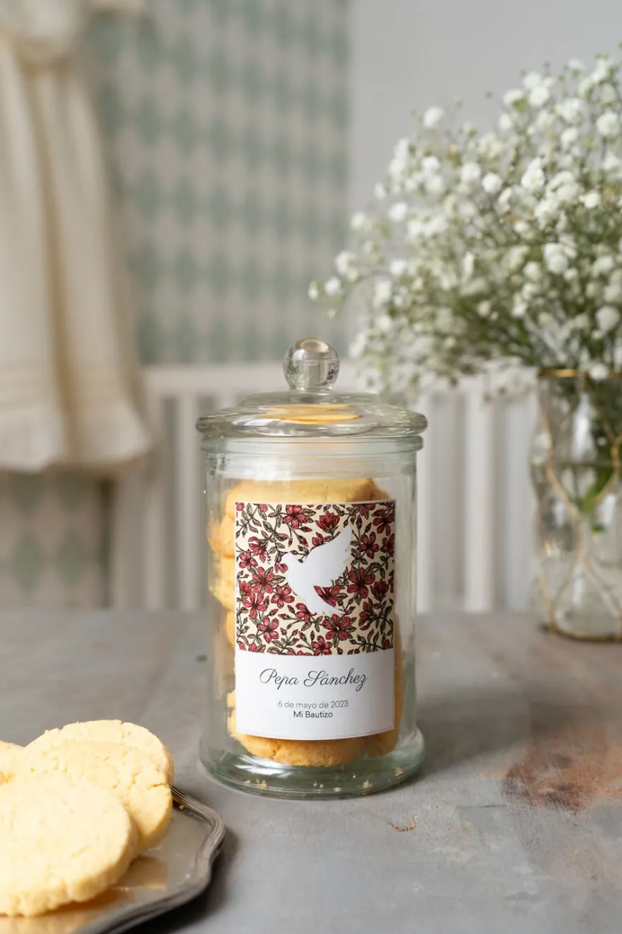Regala a tus invitados nuestras deliciosas bretonas en tarro de cristal personalizado con un recordatorio con el nombre y fecha del bautizo.
