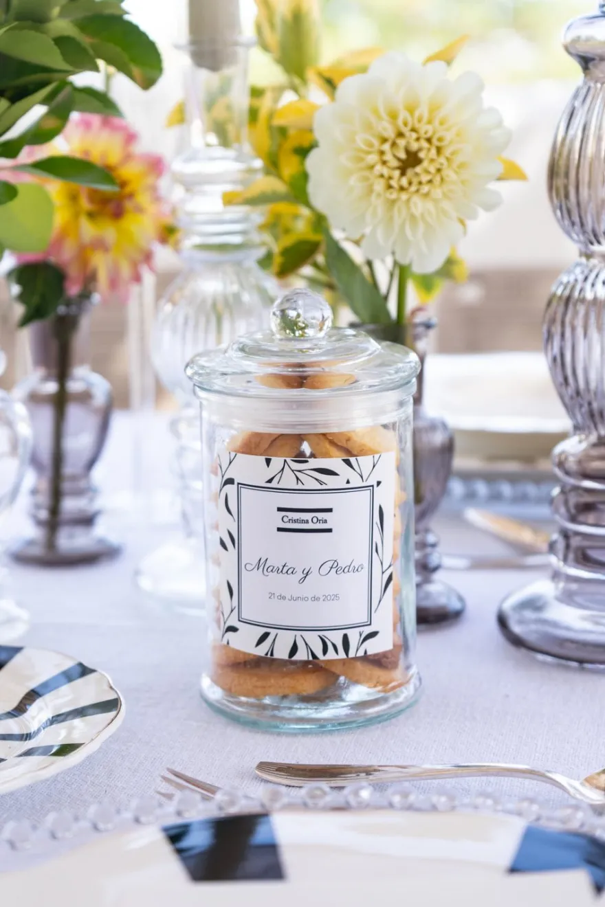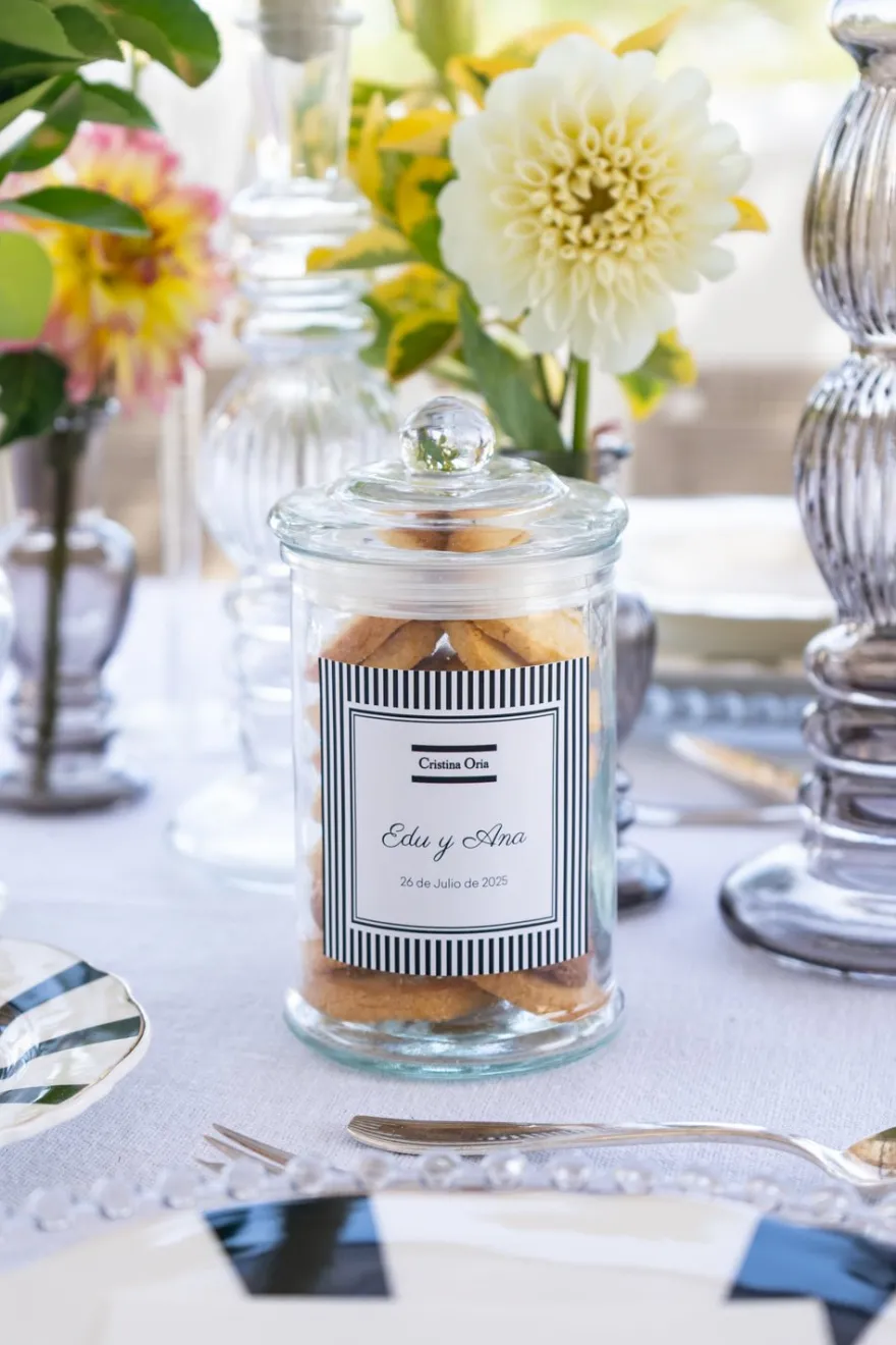 Regala a tus invitados nuestras deliciosas bretonas en tarro de cristal personalizado con un recordatorio con vuestros nombres y la fecha del enlace.