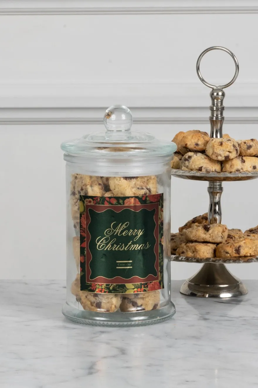 Nuestras deliciosas cookies de chocolate presentadas en un tarro de cristal con dedicatoria «Merry Christmas».