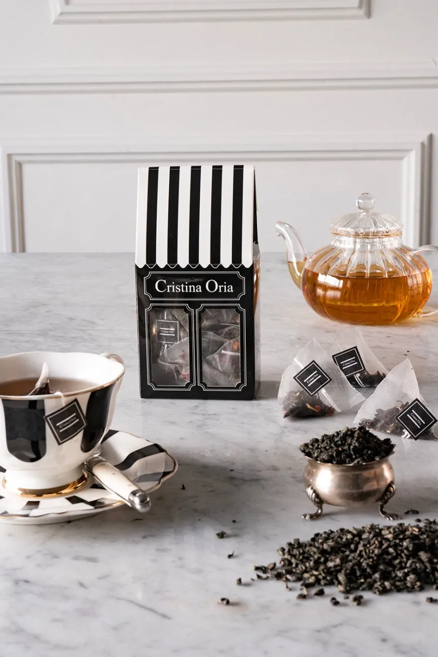 Caja con diseño propio Cristina Oria con quince pirámides en su interior de té moruno.