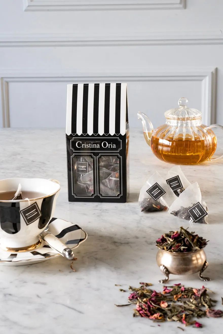 Caja con diseño propio Cristina Oria con quince pirámides en su interior de té verde pétalos de rosa.