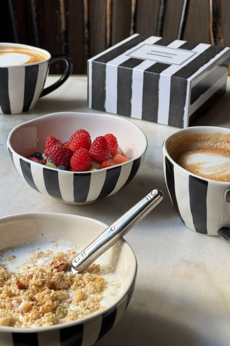 Cuenco de New Bone China en color blanco con rayas verticales en color negras, su diseño es ligeramente irregular con estilo artesanal.