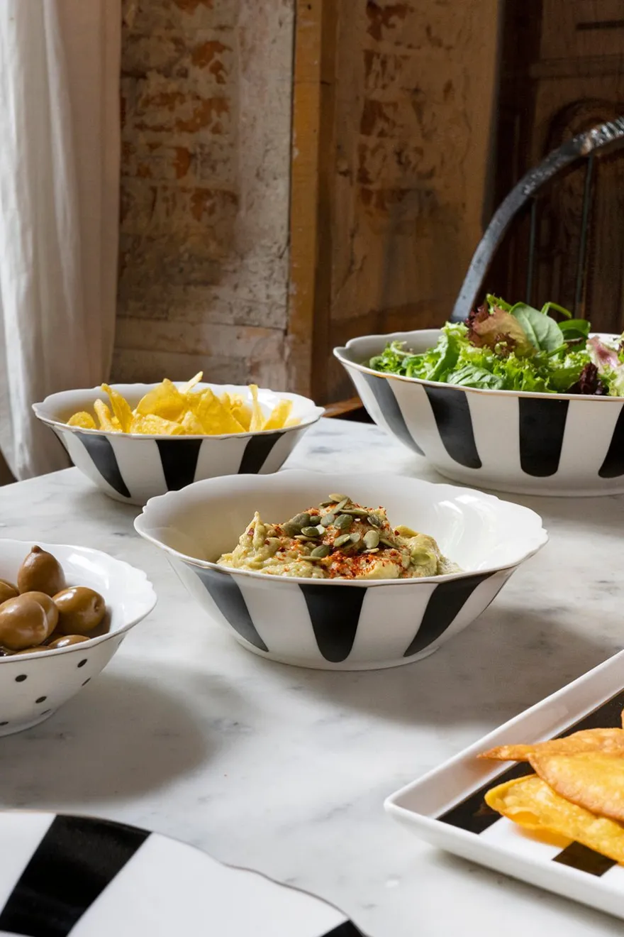 Con nuestro diseño propio de rayas blancas y negras, y con delicado filo dorado en su borde.