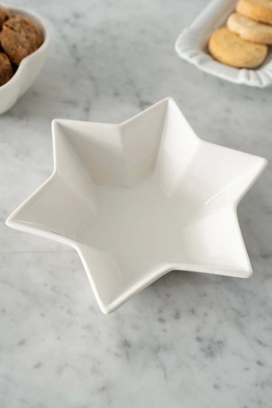 Recipiente de cerámica con diseño de estrella en color blanco, ideal para darle un toque súper especial y diferente a tus mesas durante cualquier época del año.