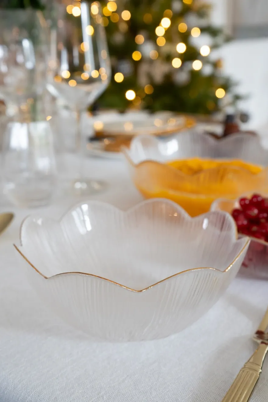 Cuenco de cristal con diseño de flor y borde ondulado con filo dorado decorando, ideal para complementar tus mesas durante cualquier época del año, en ocasiones especiales, o incluso para las uvas en fin de año.