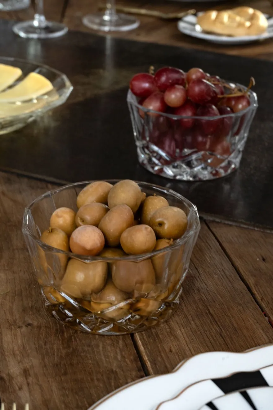 Cuenco tallado con diseño de racimo de espigas, de vidrio sodocálcico muy resistente. Ideal para aperitivos o incluso para las uvas en fin de año.