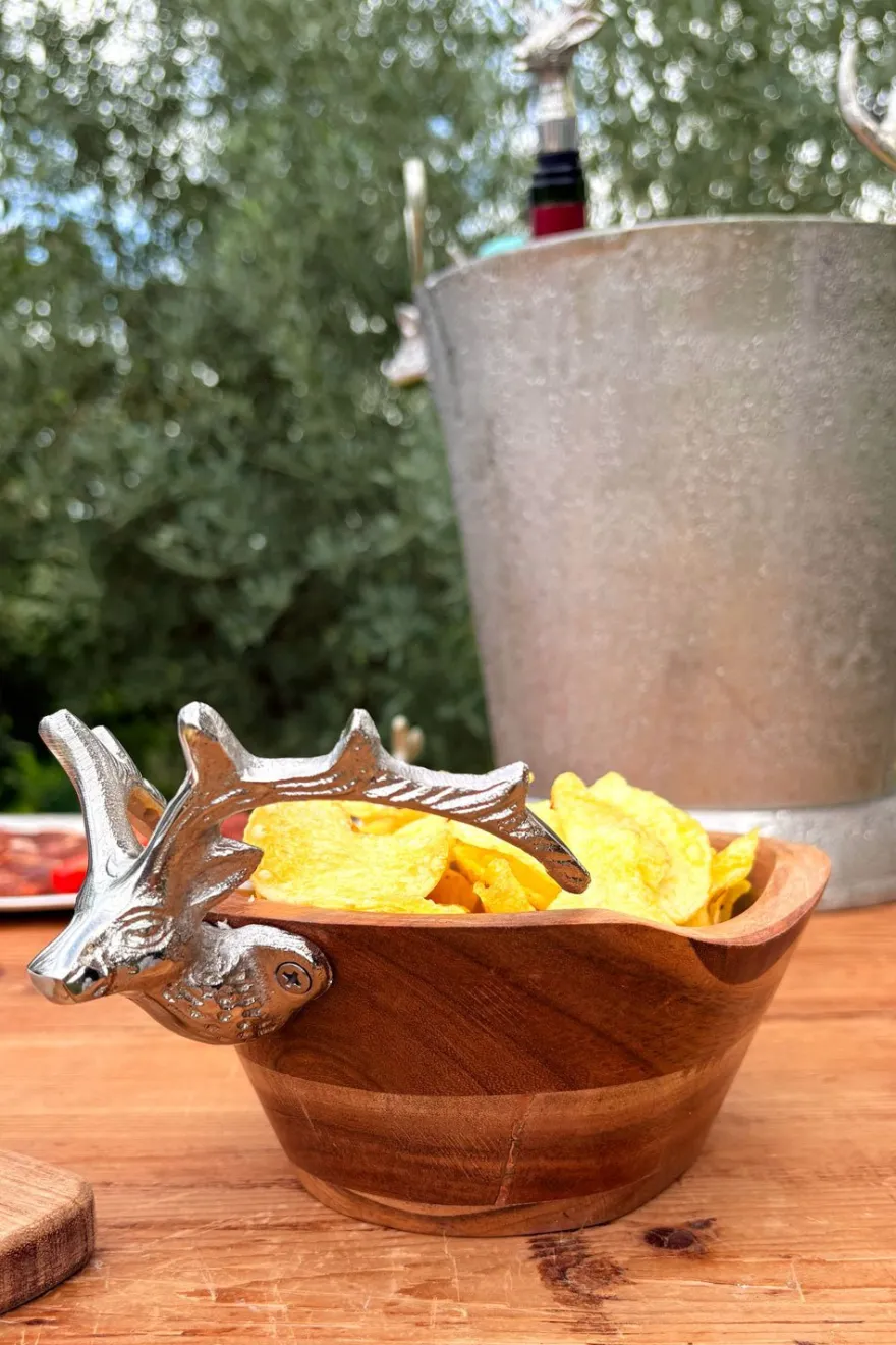 Cuenco de madera con detalle plateado en forma de cabeza de ciervo, que aporta un toque sofisticado y rústico a la vez. Su acabado plateado le da un toque elegante y moderno, perfecto tanto para decorar como para usar en la mesa.
