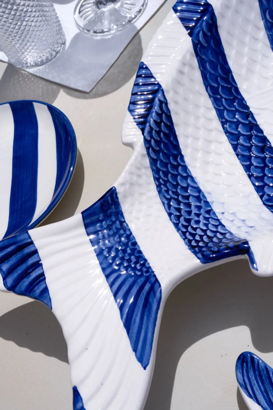 Fuente grande de cerámica portuguesa 100% artesanal edición limitada, con diseño de pez de rayas azules y blancas, ideal para complementar y dar un toque fresco, original y diferente a tus mesas este verano.