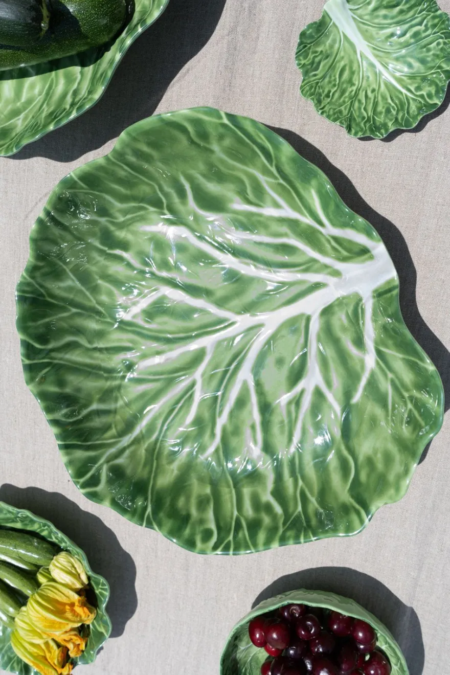 Fuente grande con diseño de hoja de col de nuestra vajilla de melamina, ideal para complementar y dar un toque fresco, original y diferente a tus mesas este verano.