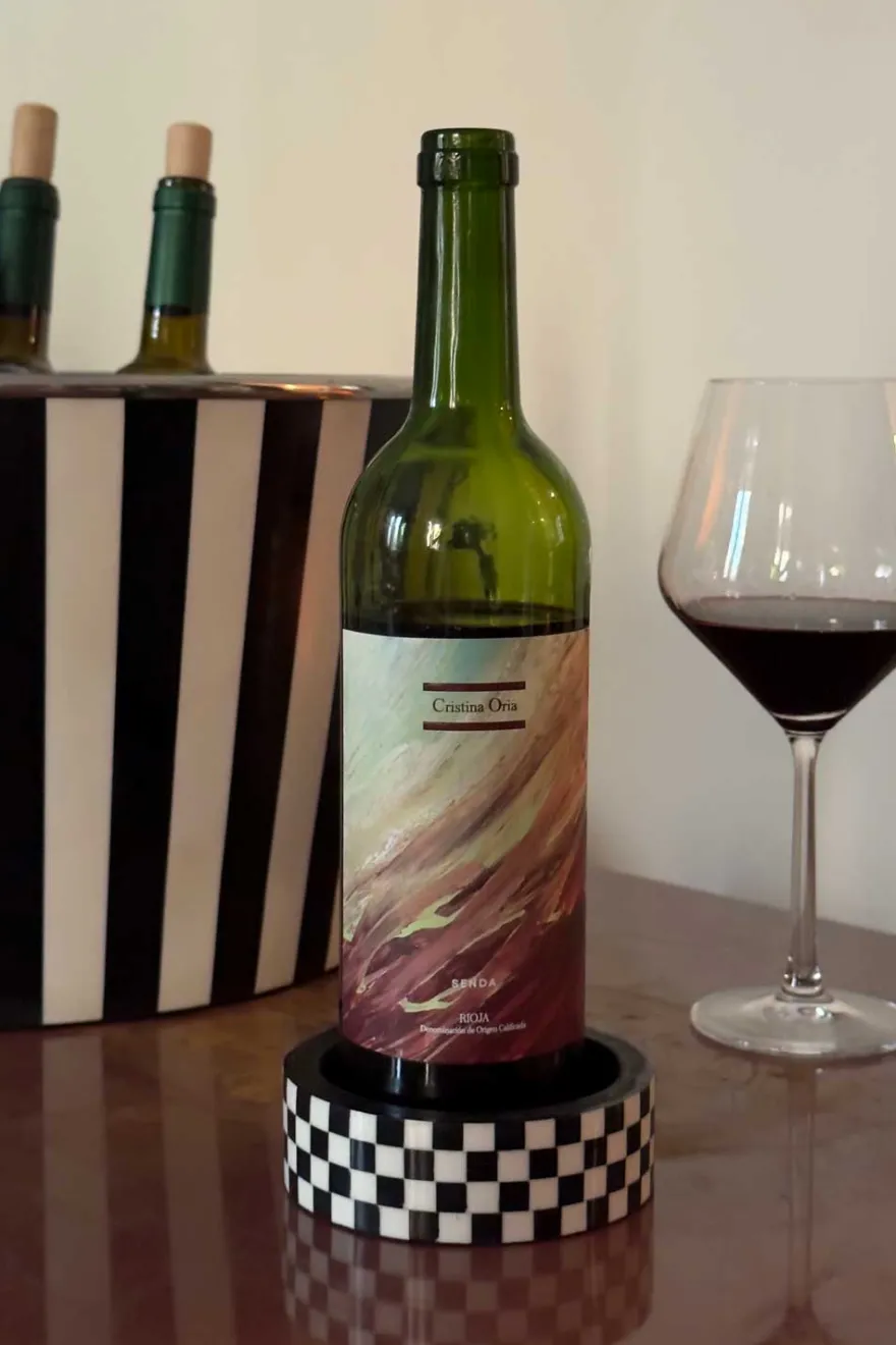 Posa botellas elaborado en resina, con un elegante diseño de cuadros blancos y negros que aporta un estilo moderno y sofisticado. Fabricado de manera artesanal, cada pieza presenta patrones y acabados únicos.