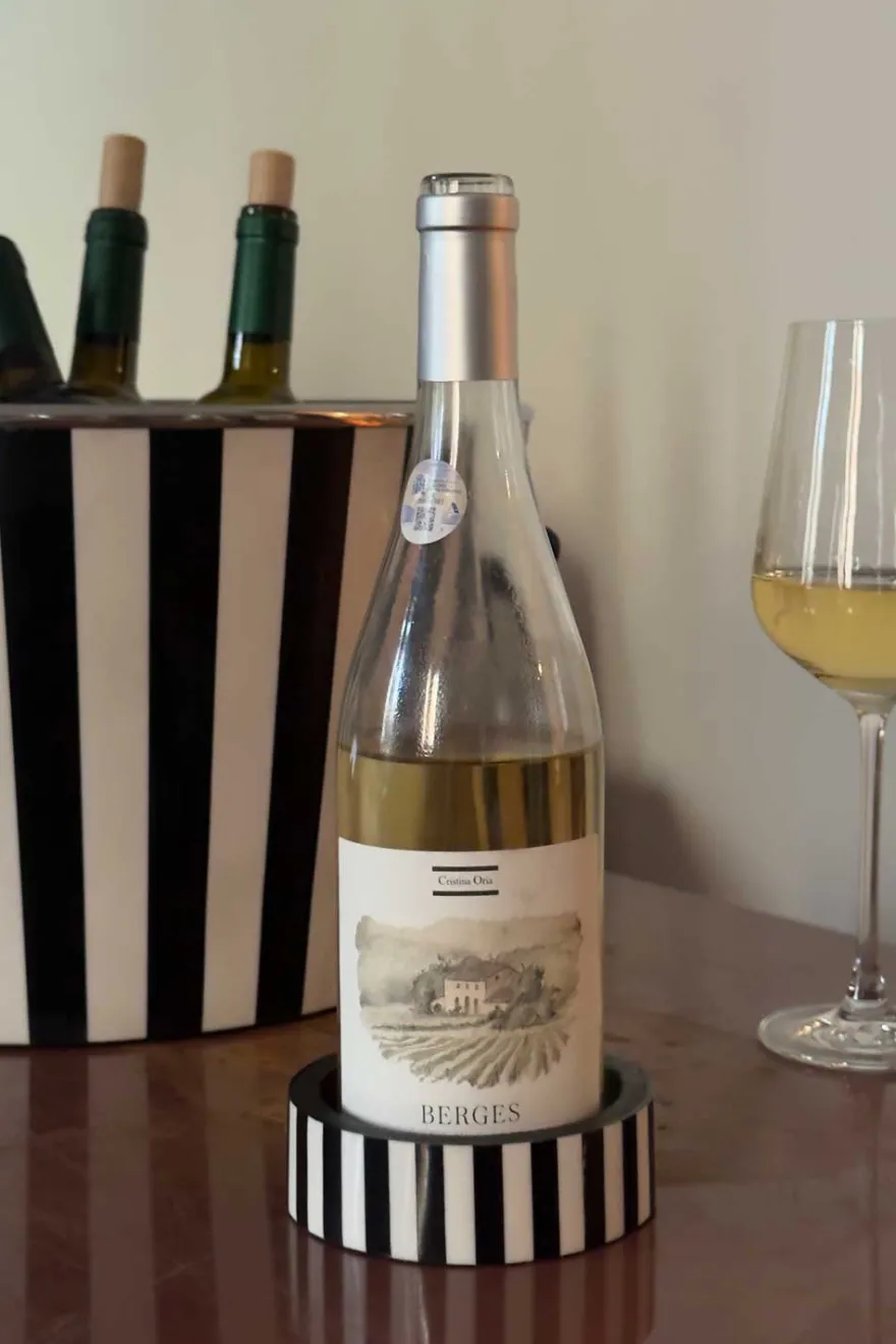 Posa botellas elaborado en resina, con un elegante diseño de rayas blancas y negras que aporta un estilo moderno y sofisticado. Fabricado de manera artesanal, cada pieza presenta patrones y acabados únicos.
