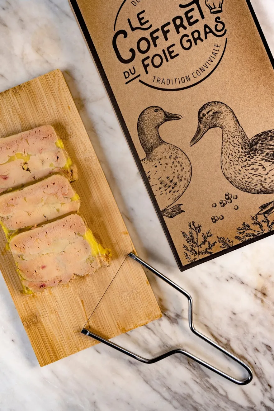 Este set para los amantes del foie incluye una lira y una tabla de madera para servir este producto. Lo recibirás en una caja muy original.