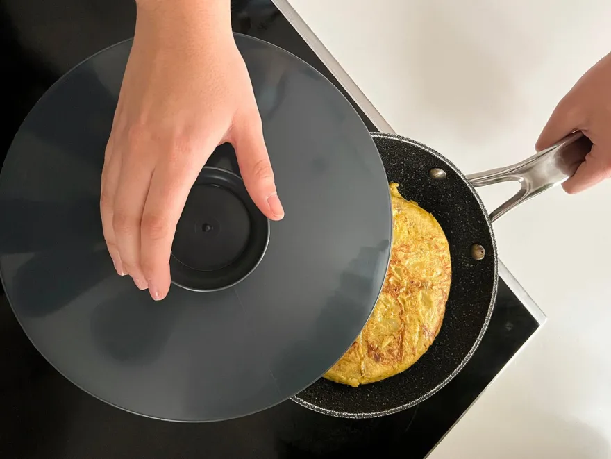 Uso: Deslizar la tortilla de la sartén sobre el gira tortillas al darles la vuelta. Inclinar después un poco la sartén, para que la tortilla vuelva a parar perfectamente en la misma, con tan sólo un ligero giro del gira tortillas.