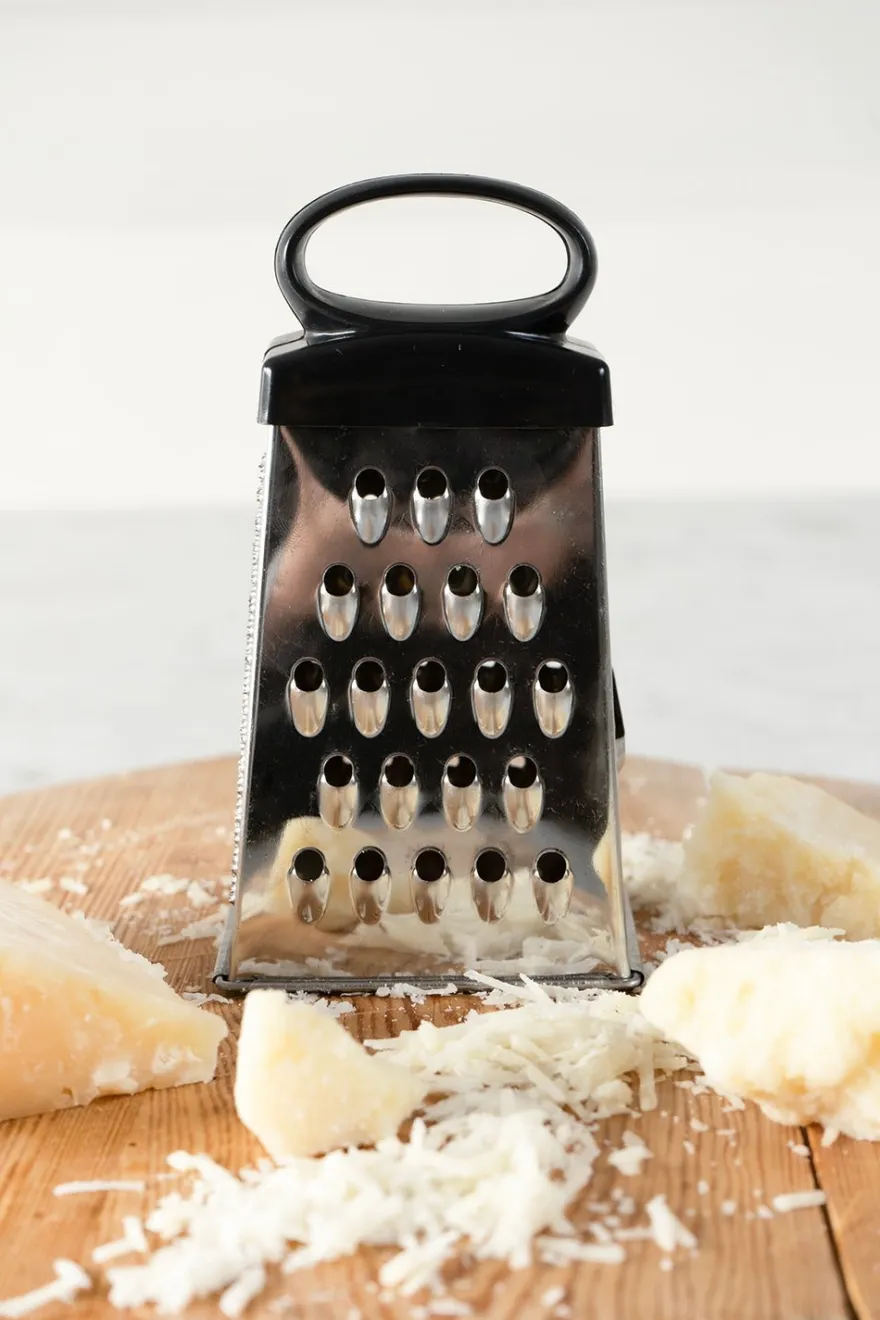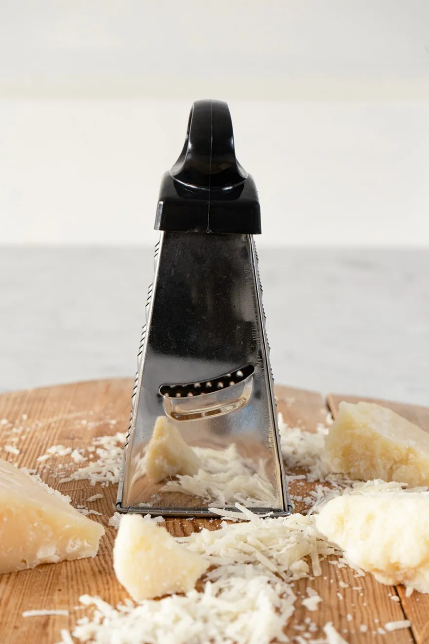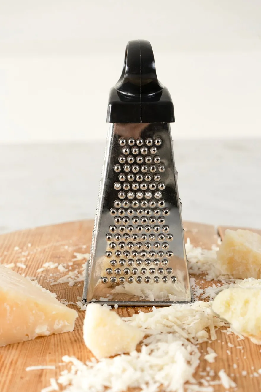 Rallador de acero inoxidable y mango de plástico, con cuatro caras distintas para poder rallar: fino, medio, grueso y virutas.