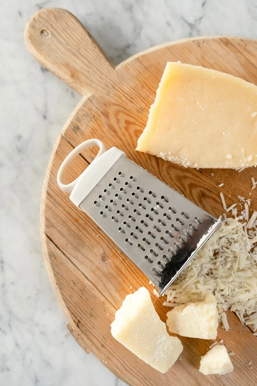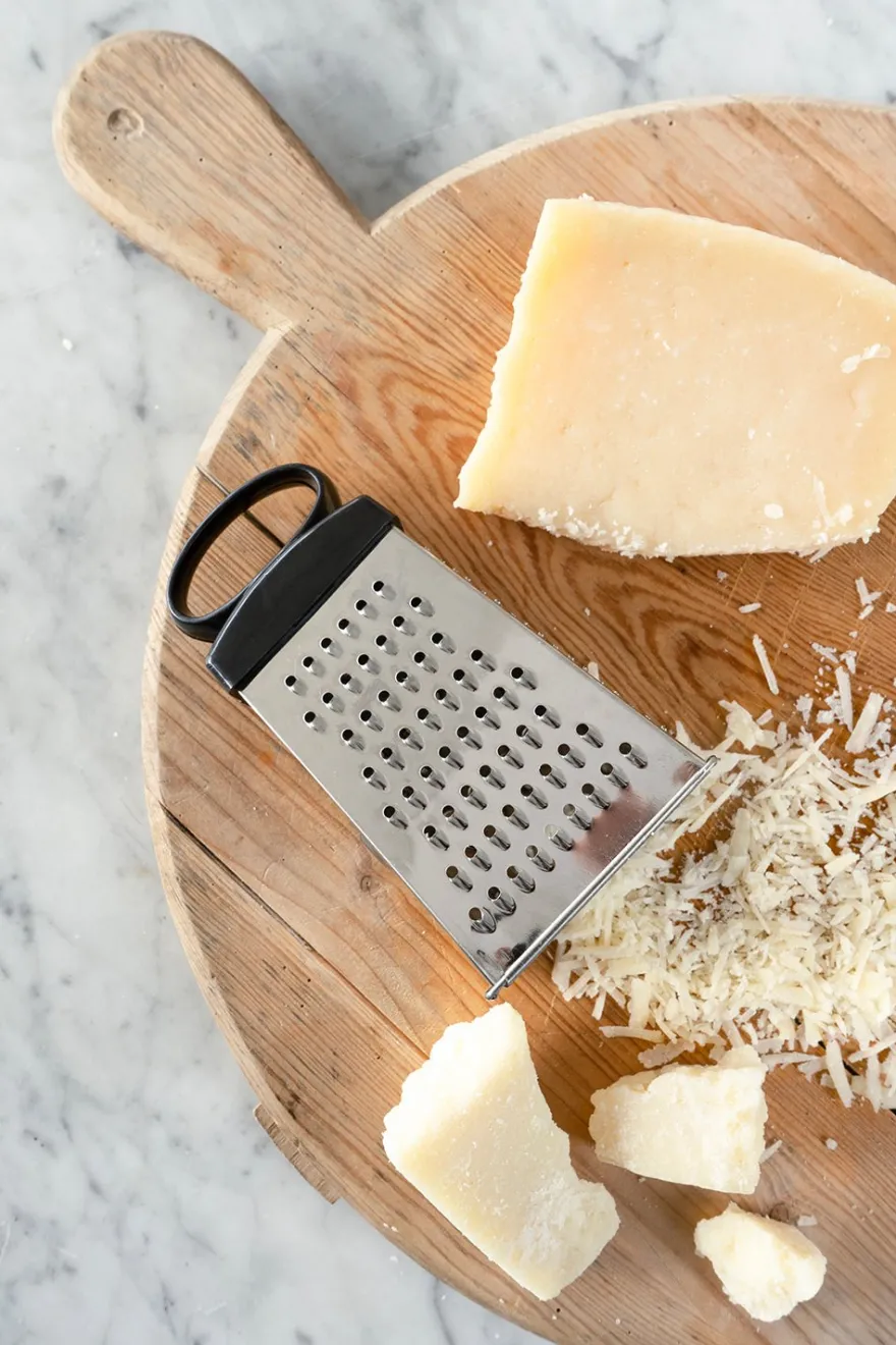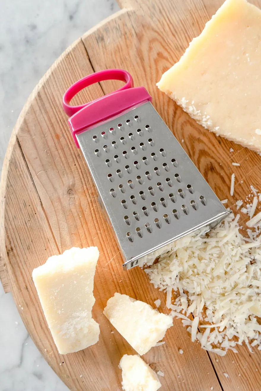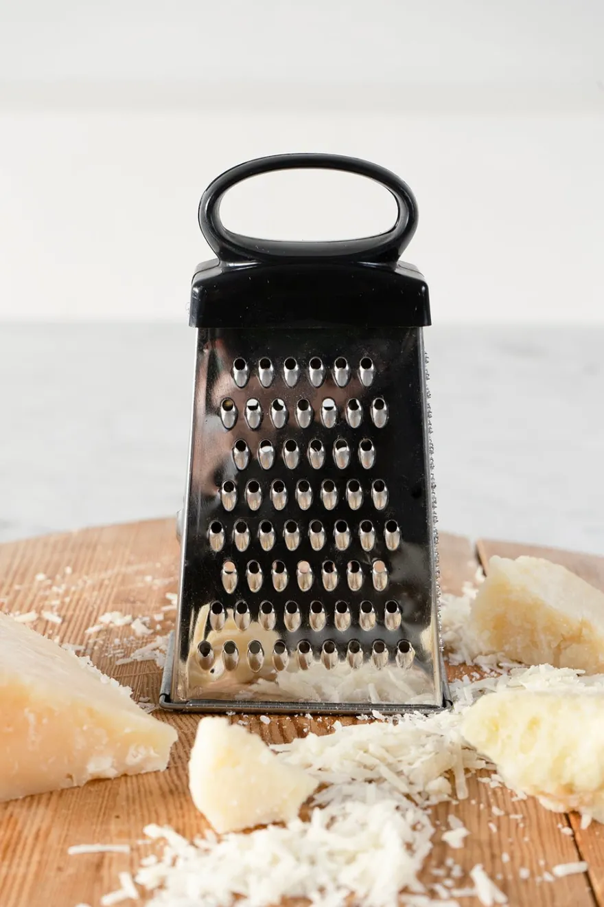 Rallador de acero inoxidable y mango de plástico, con cuatro caras distintas para poder rallar: fino, medio, grueso y virutas.