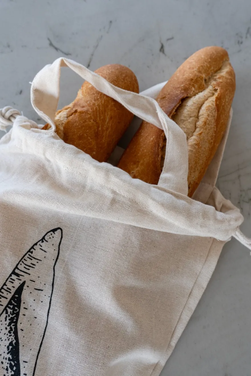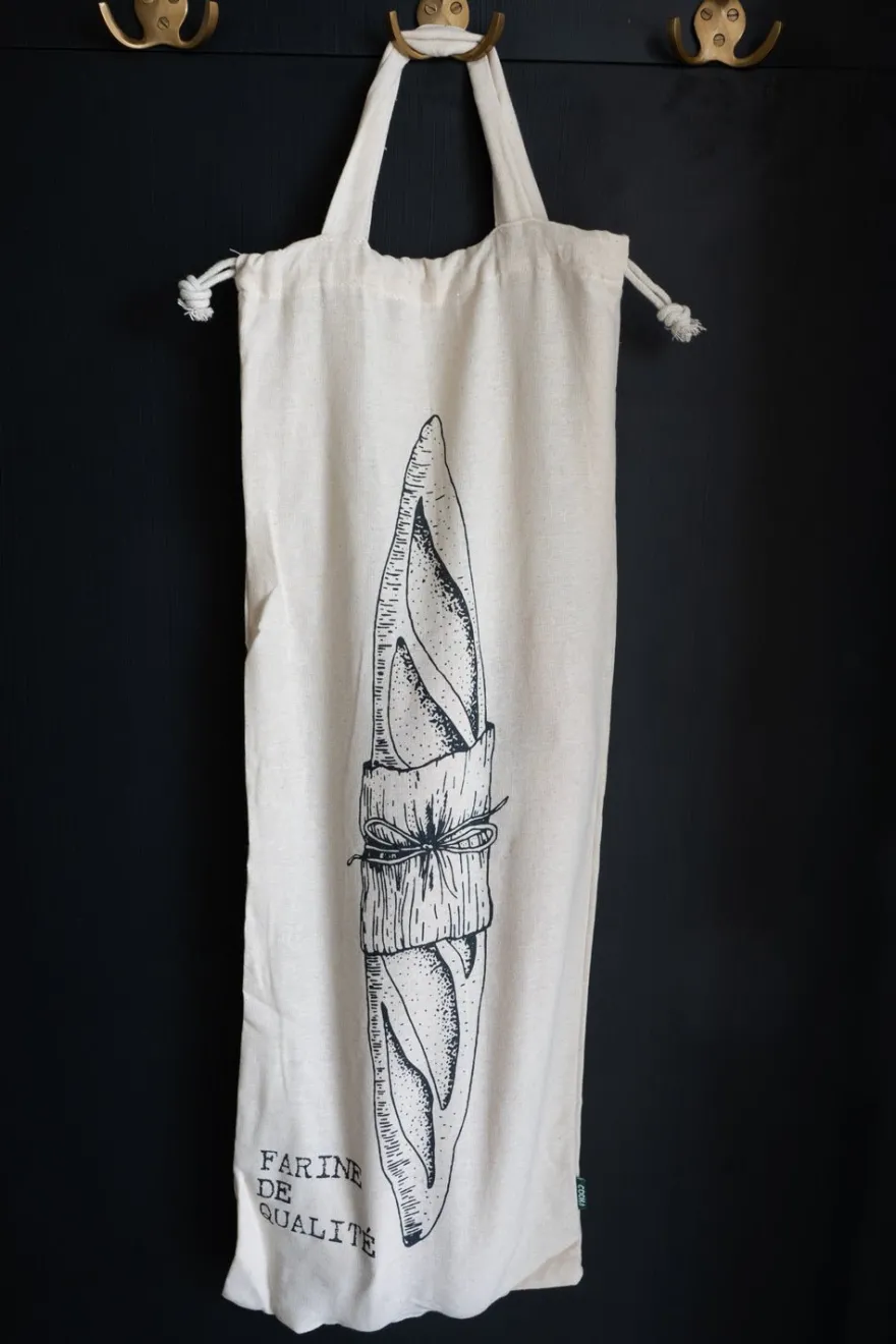 Bolsa de algodón para transportar o simplemente mantener baguettes y otros panes. Tiene una correa de cierre, y asas para poder colgarla.