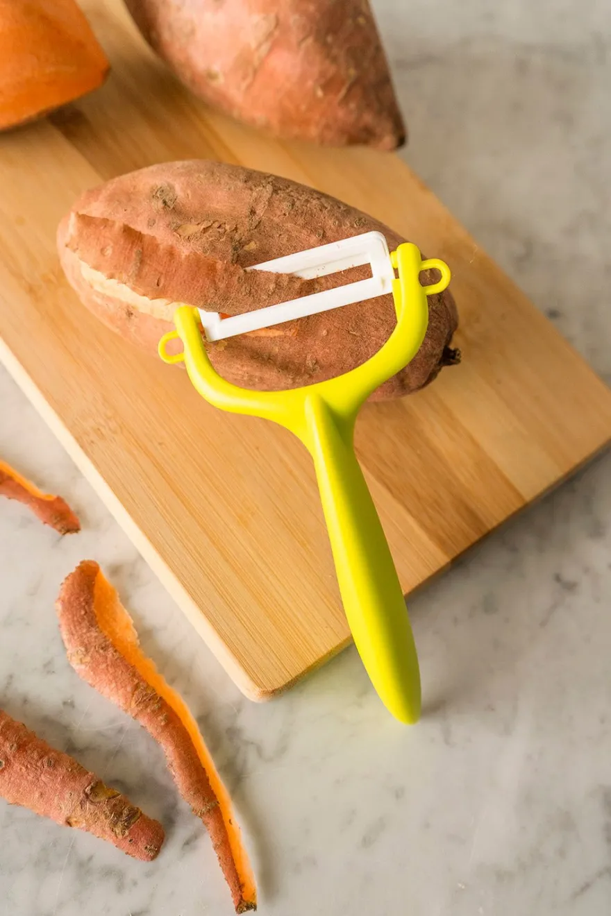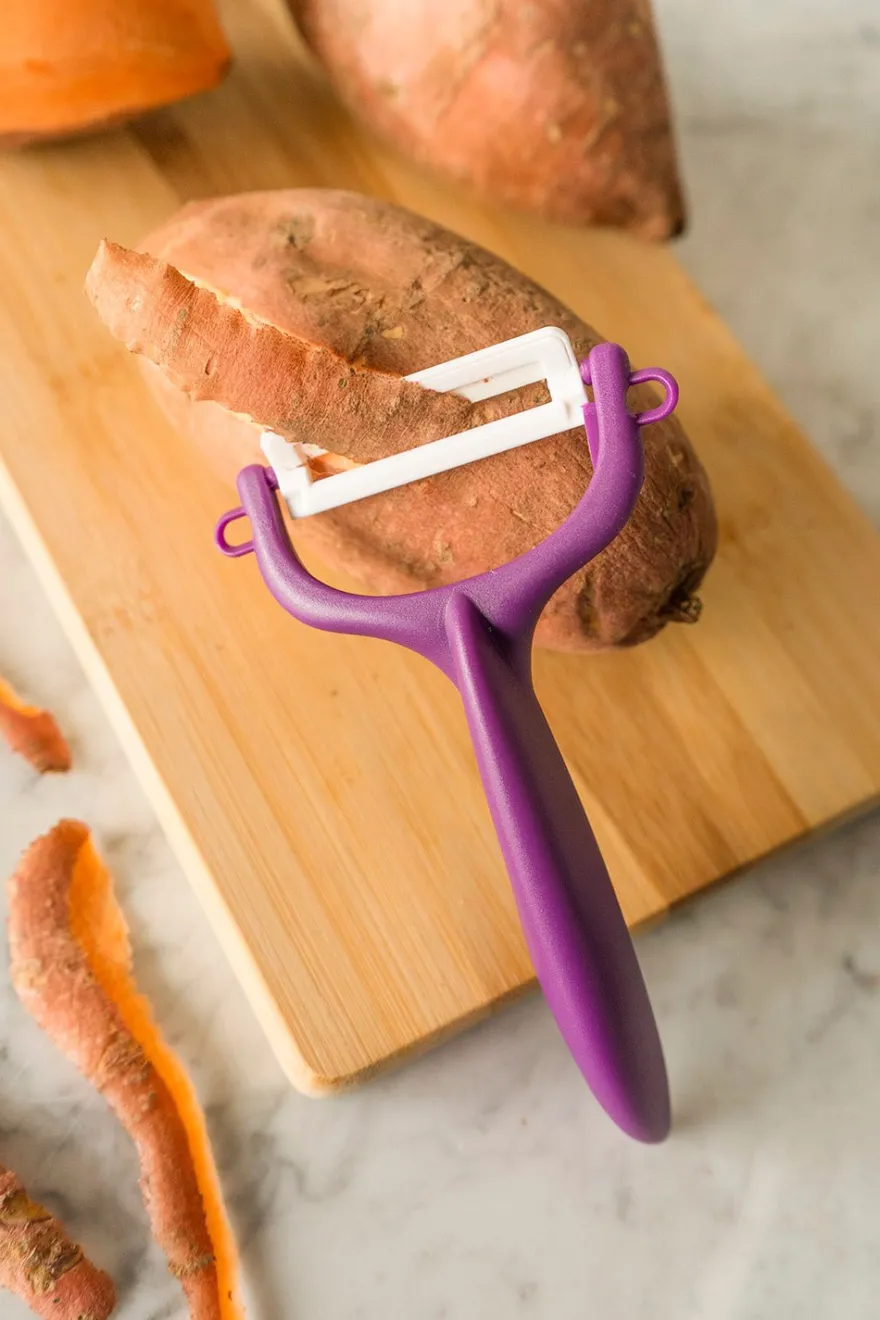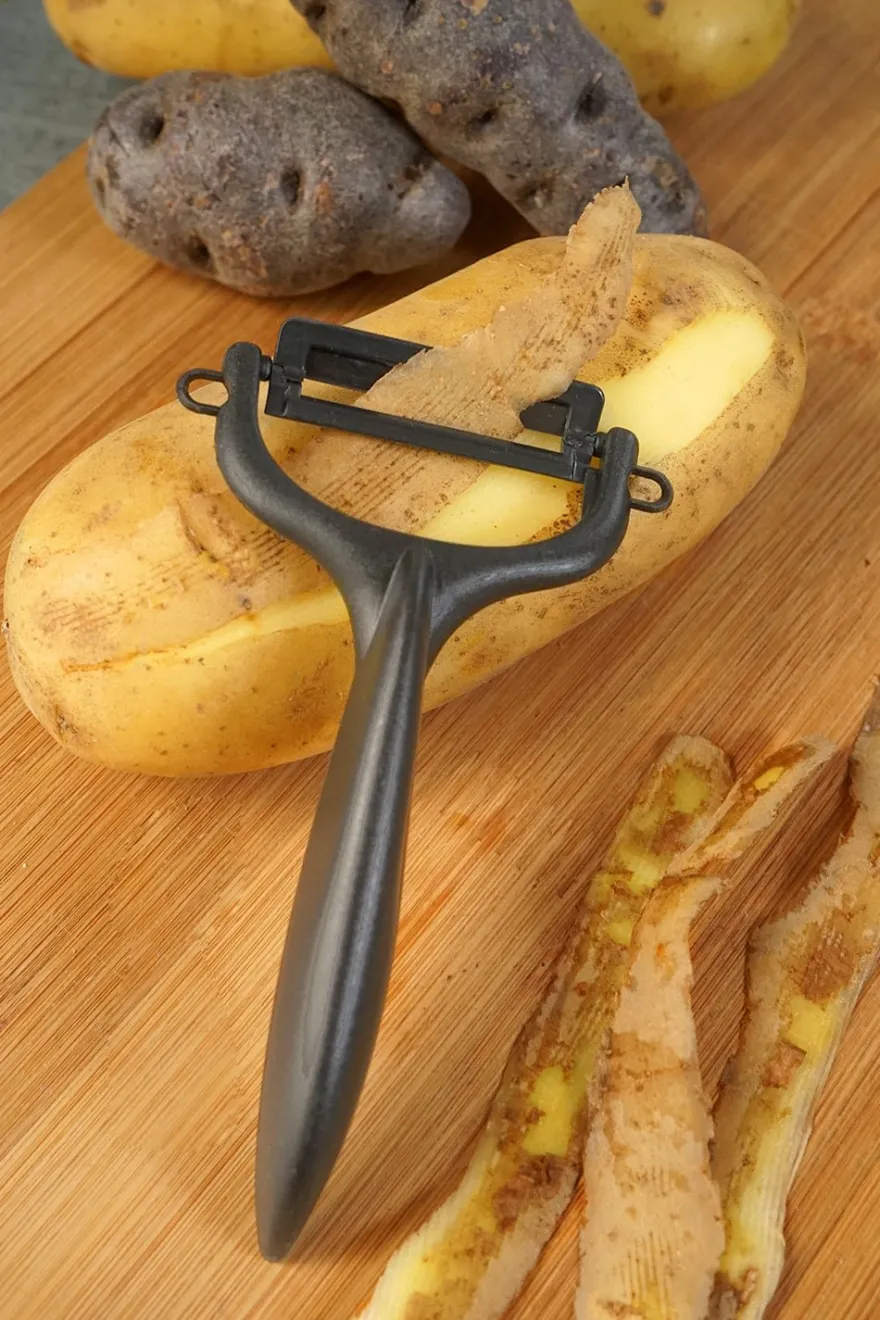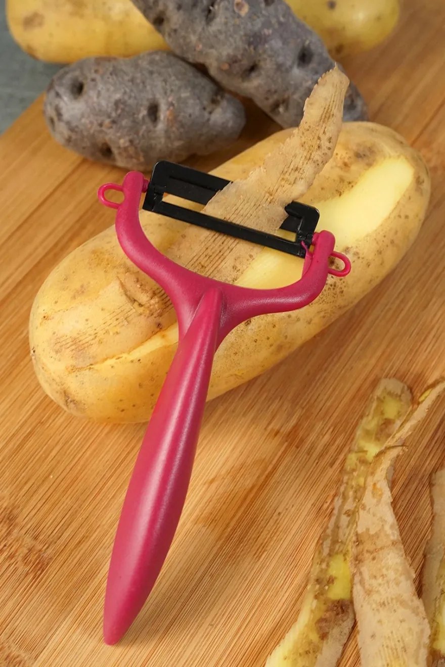 Pelador de verduras en tres colores diferentes: blanco, rojo y negro