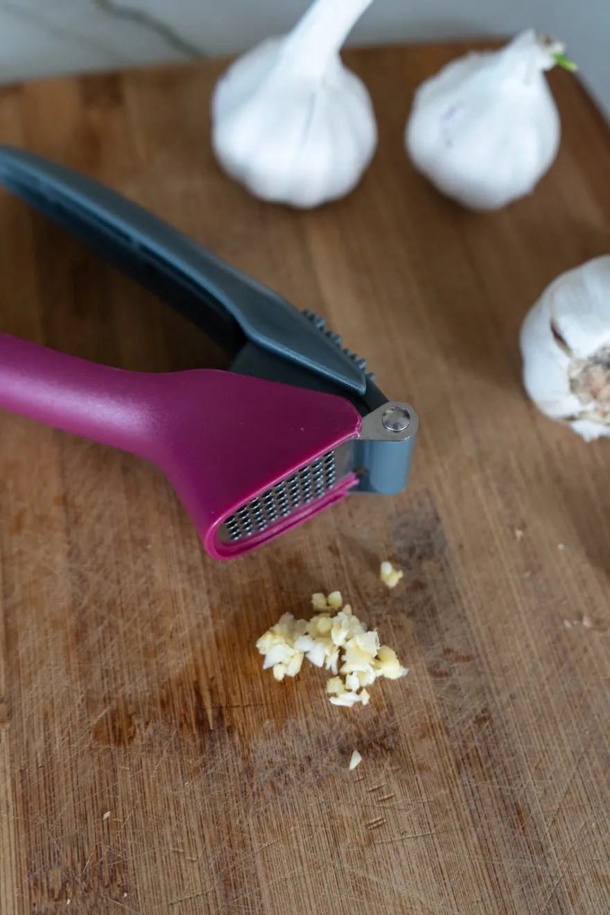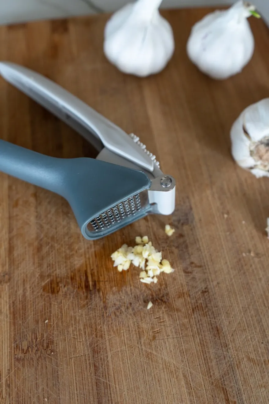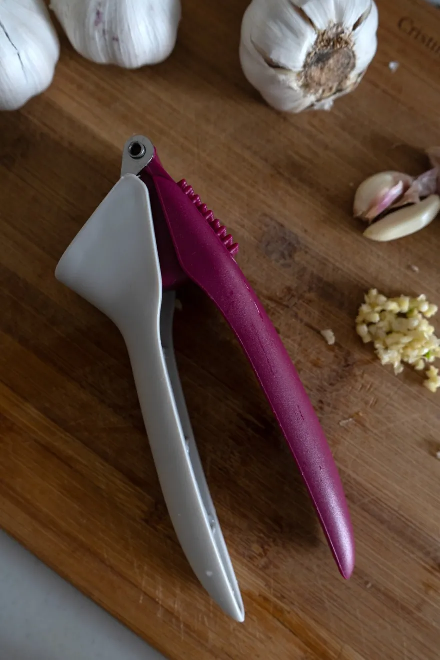 Prensador de mano con el que picarás los ajos con tan solo un movimiento gracias a sus dos asas. Tiene un depósito para almacenar el ajo una vez cortado.
