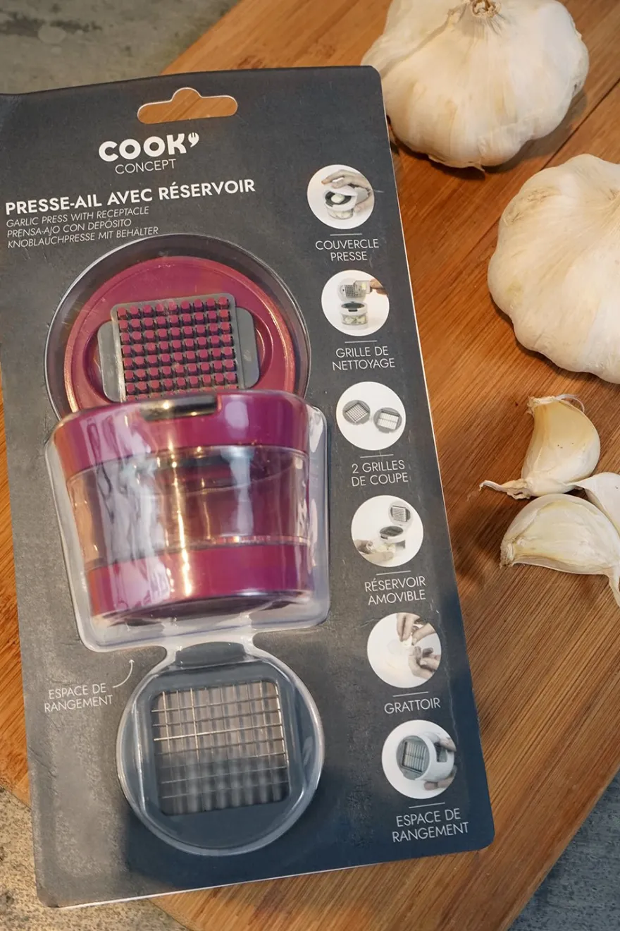 Prensador para ajos con dos hojas de corte (láminas y cuadraditos).