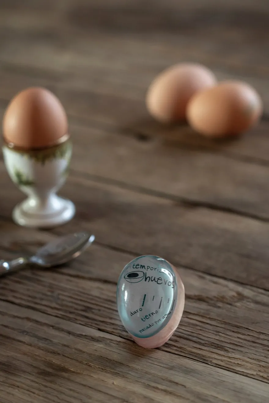 Cambia de color para indicar el grado de cocción (se va poniendo de color blanco, y en función de la línea marcada por la franja blanca te marca el grado de cocción del huevo) :
