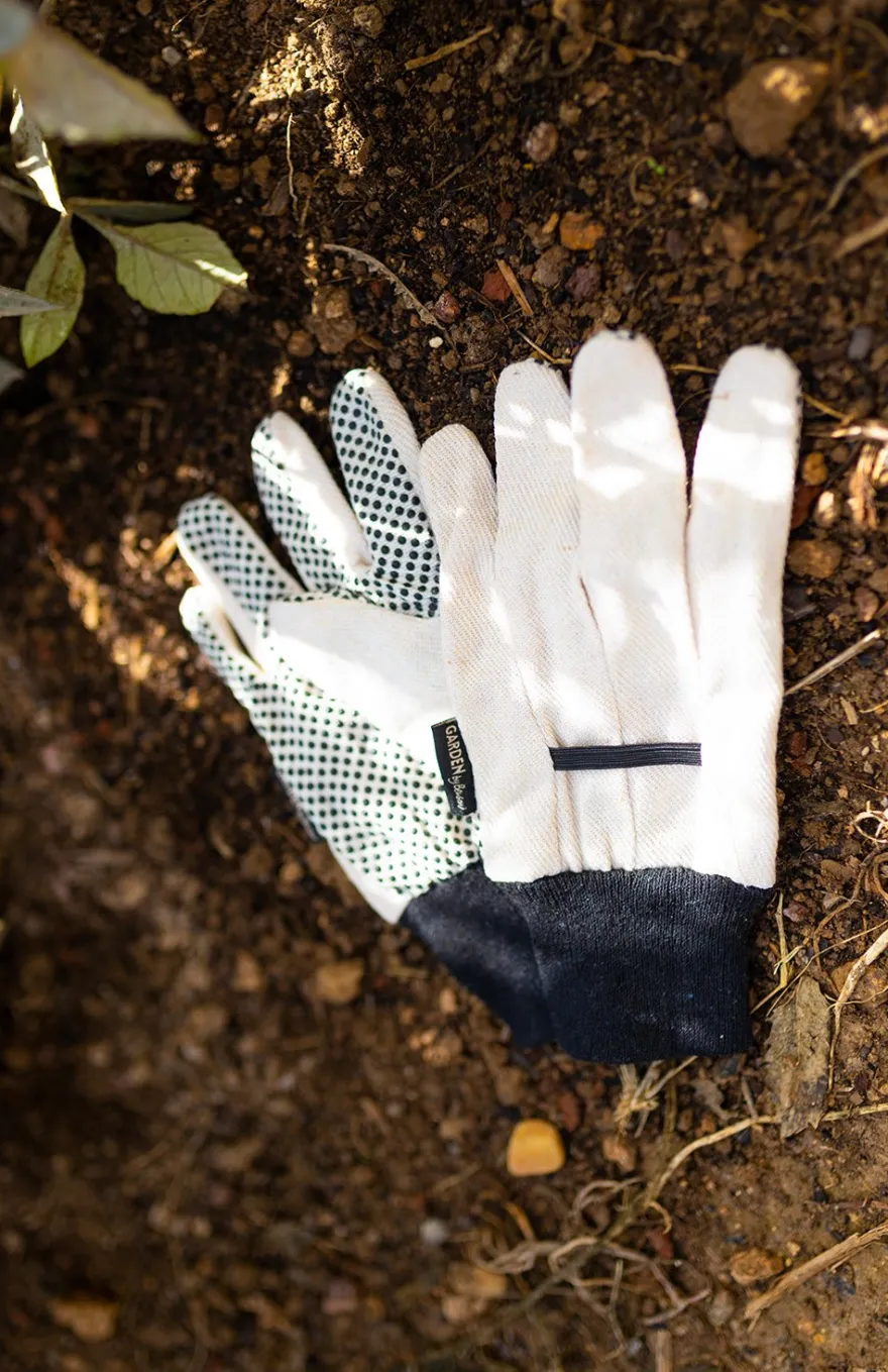 Guantes de jardinería sencillos y funcionales de 100% algodón, con puños de punto para una mayor comodidad. Buena sujeción en la palma gracias a los puntos negros de agarre.