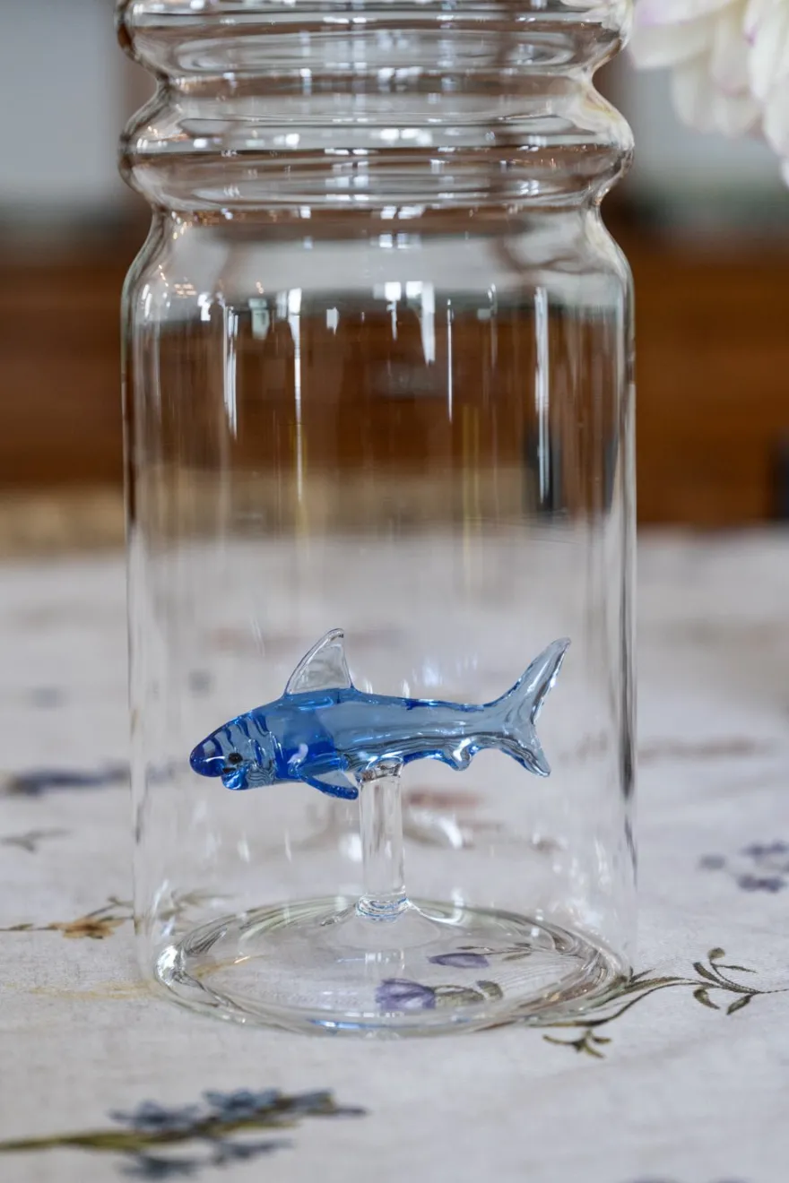 Botella para agua con original figura de tiburón fijada en su interior, perfecta para su uso diario. El tiburón parece surcar un océano invisible, su diseño detallado captura la belleza y grandeza del mundo marino. Tiene un tamaño muy práctico y un tapón hermético.