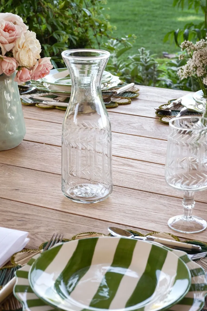Jarra de nuestra cristalería de cristal soplado y tallada a mano que destaca por su elegancia atemporal y su meticuloso trabajo artesanal. Las irregularidades del diseño hacen única cada pieza.