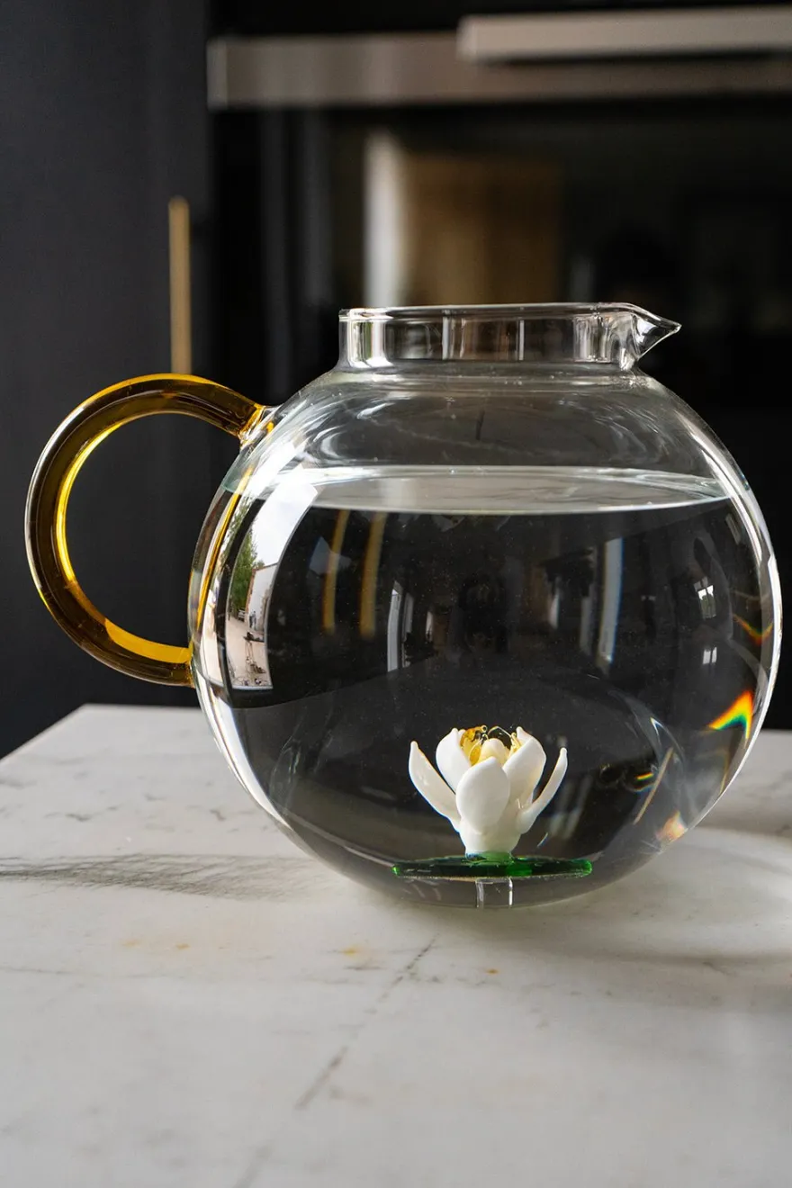 Jarra globo de vidrio borosilicato decorada interiormente con una flor. Cada elemento interior de esta colección, está hecho a mano en vidrio soplado, haciendo de cada producto una pieza única.