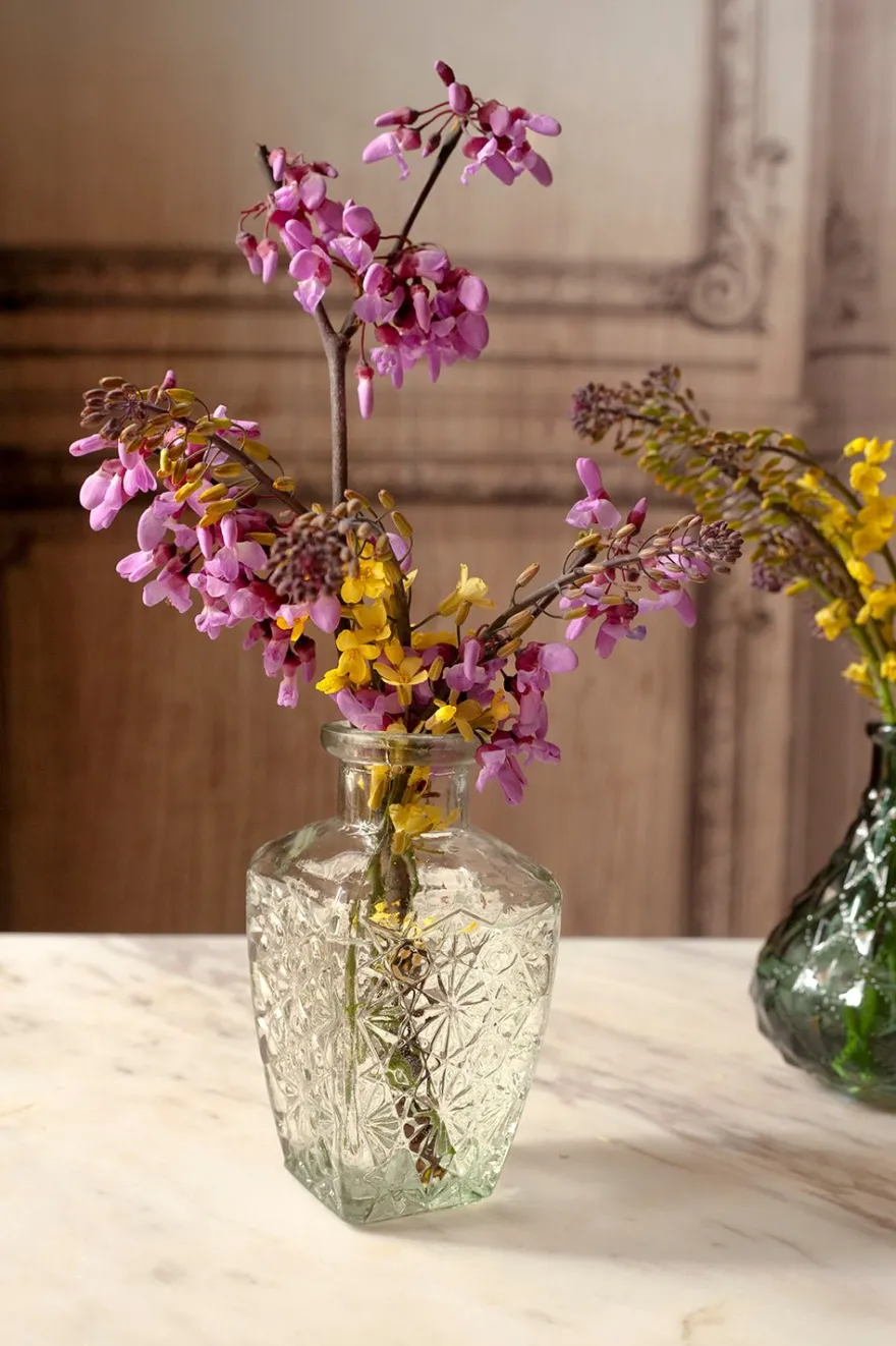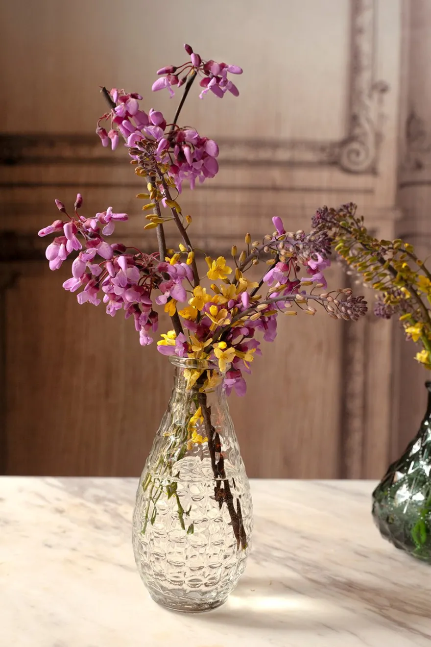 Floreros pequeños o jarroncitos de cristal tallado en color transparente, disponibles en seis diseños diferentes. Perfectos para decorar terrazas e interiores.