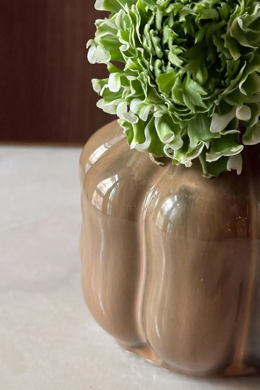 Jarrón artesanal de cerámica esmaltada en tono marrón, con un diseño orgánico que recuerda la forma de una calabaza o fruto otoñal. Su acabado brillante realza las suaves curvas y texturas del modelado, aportando un toque natural y elegante a la decoración.