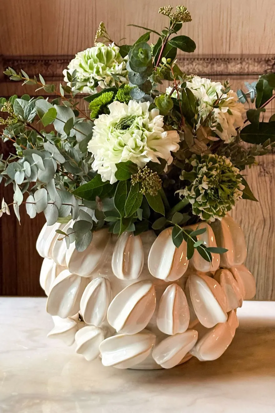 Jarrón de gres blanco con un delicado diseño de carambolas en relieve que aporta textura y carácter a la pieza. De líneas equilibradas y estilo atemporal, es ideal para decorar espacios contemporáneos o aportar un toque artesanal a ambientes más clásicos. Perfecto para lucir solo como objeto decorativo o acompañado de flores frescas o secas.