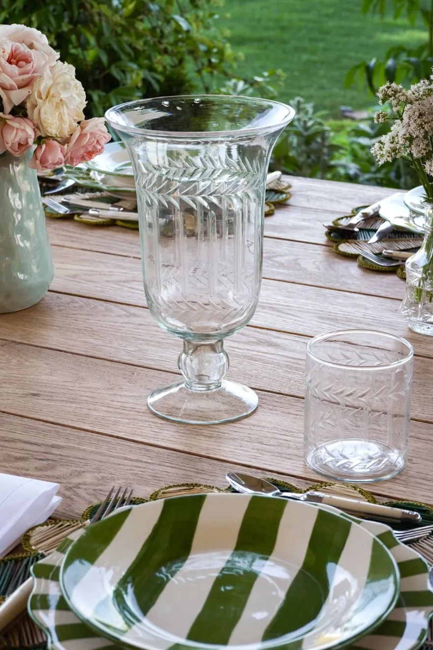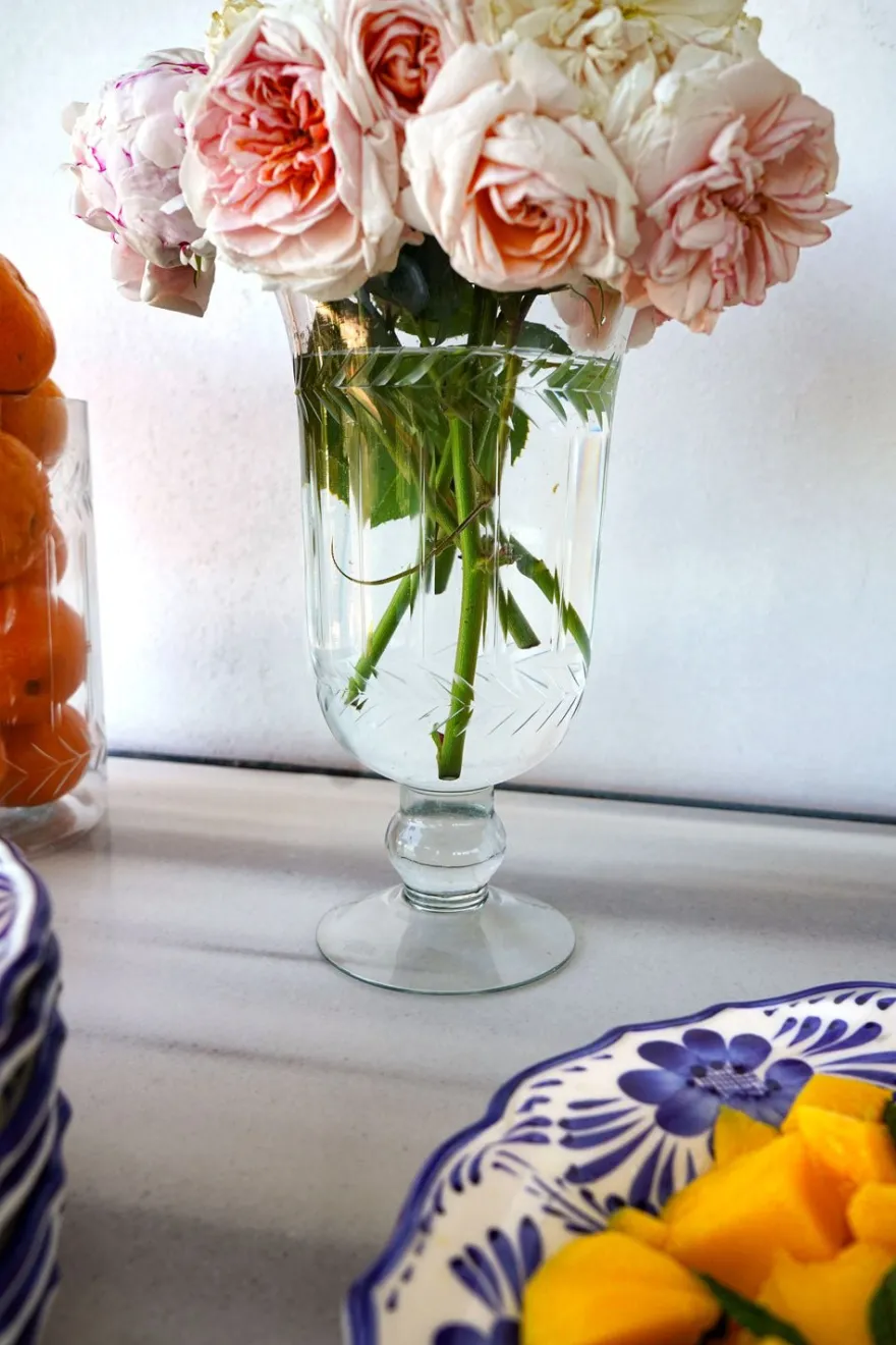 Jarrón con base de cristal soplado y tallado a mano que destaca por su elegancia atemporal y su meticuloso trabajo artesanal. Las irregularidades del diseño hacen única cada pieza.