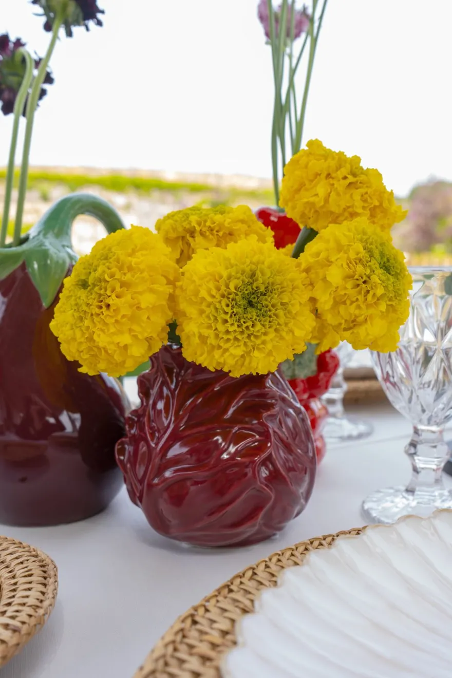 Jarrón de loza fina esmaltada con diseño de alcachofa en tonalidades granates,100% artesanal, ideal para complementar y dar un toque fresco, original y diferente a cualquier rincón de tu casa, ya sea interior o exterior. Puedes llenarlo con flores o simplemente usarlo para decorar sin nada en su interior.