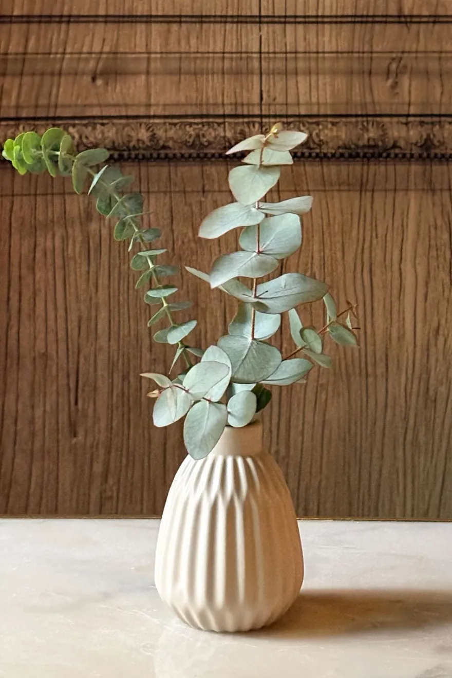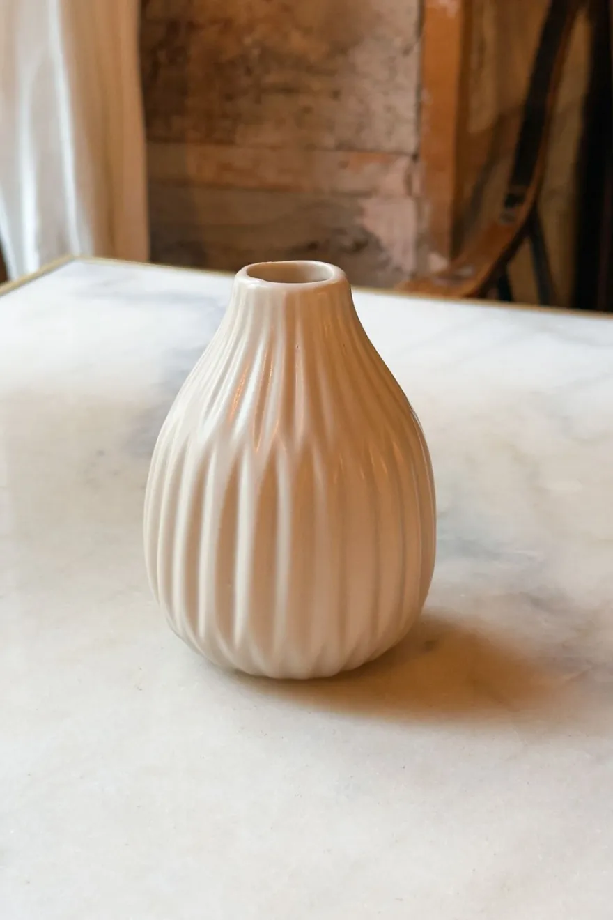 Jarrones de porcelana en tono beige suave, con un delicado relieve estriado que aporta textura y ritmo a la forma. Su acabado mate y líneas orgánicas transmiten calma y naturalidad, convirtiéndolos en piezas versátiles que funcionan tanto solas como en conjunto. Ideales para flores frescas, secas o como objeto decorativo atemporal.