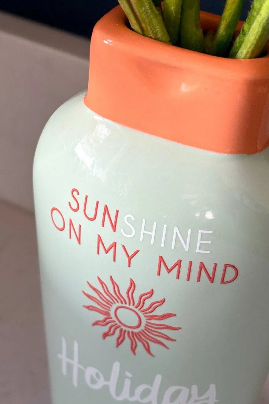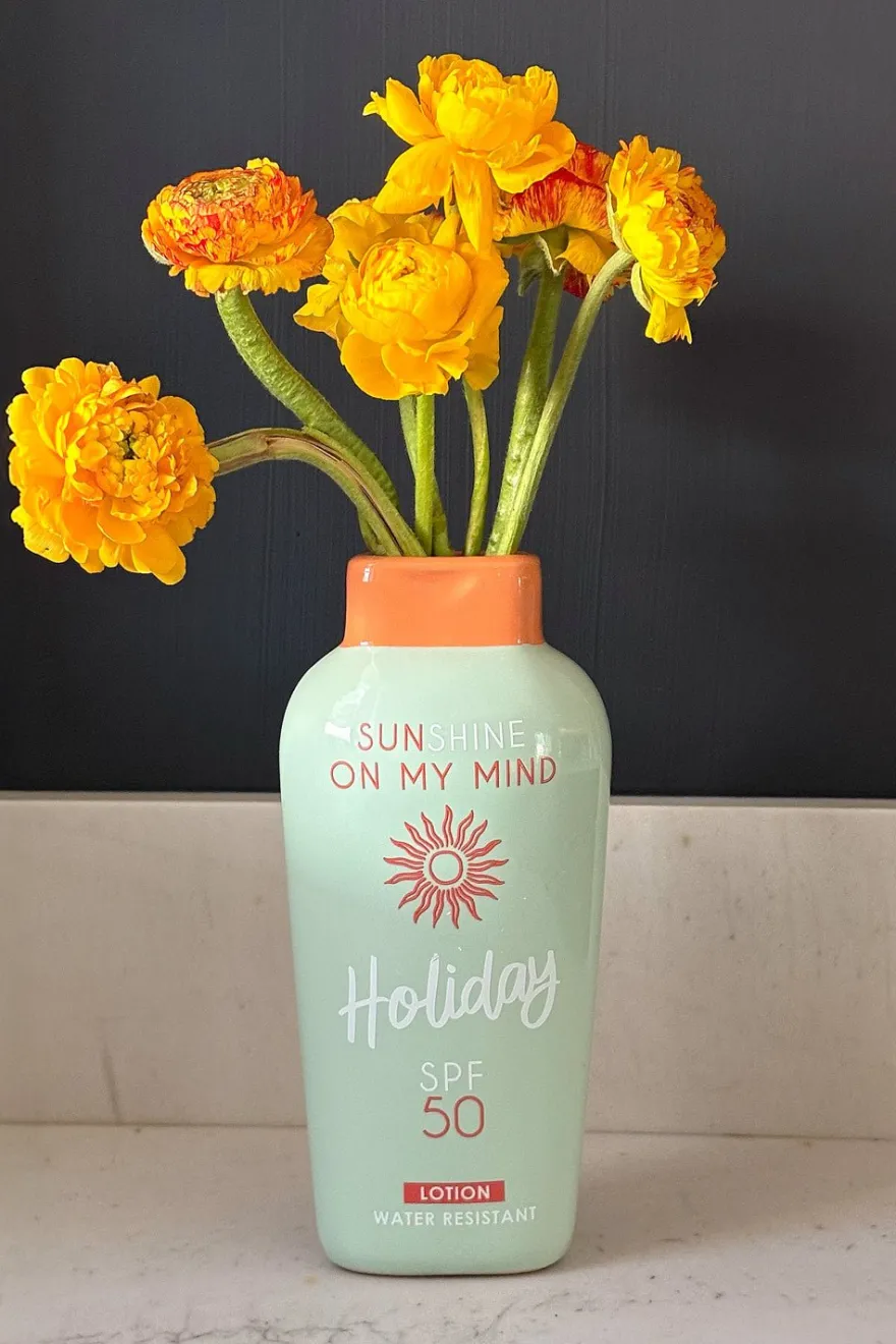 Original jarrón colorido con diseño inspirado en la crema solar, que aporta un toque divertido y veraniego a cualquier espacio. Ideal para quienes buscan agregar personalidad y estilo a sus decoraciones con un guiño a la temporada de verano.