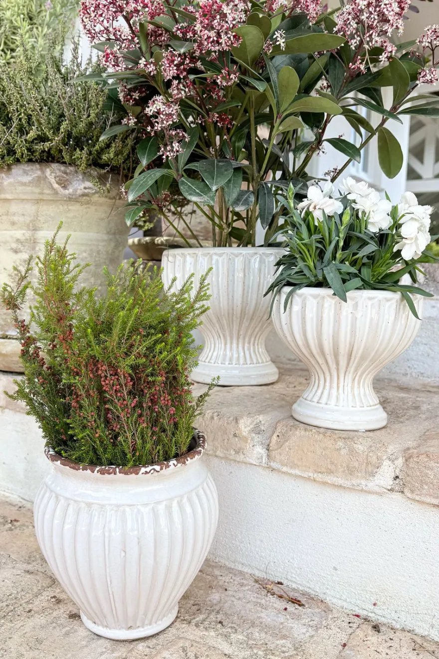 Colección de jarrones decorativos elaborados en porcelana blanco roto, diseñados para aportar elegancia a cualquier espacio. Su acabado en tono neutro y su relieve estriado resaltan un estilo atemporal que se integra fácilmente a diferentes tipos de decoración, tanto por si solos como con plantas o arreglos florales.