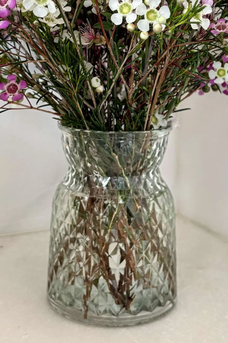 Jarrón de cristal decorativo con acabado texturizado tipo tallado, ideal para aportar un toque de elegancia y frescura a cualquier espacio. Su diseño lo convierte en una pieza versátil tanto para flores naturales como preservadas.