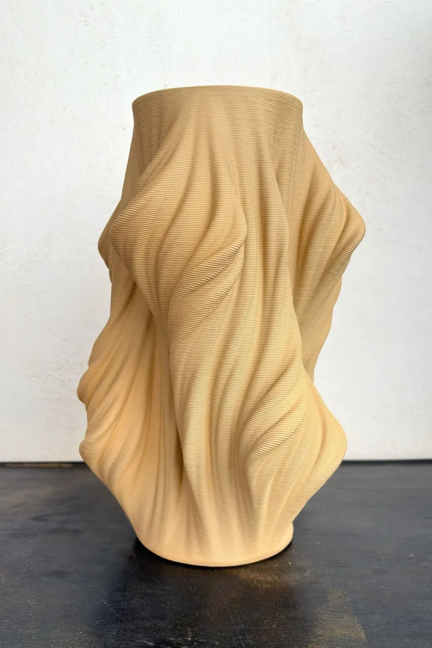 Jarrón de porcelana en color beige, con un diseño irregular que aporta un toque de modernidad y estilo único a cualquier espacio. Presenta un efecto 3D que resalta su forma y textura, creando una pieza decorativa que juega con la luz y la profundidad. Perfecto para añadir un toque artístico a tu casa, ya sea para flores frescas o como pieza decorativa por sí sola.