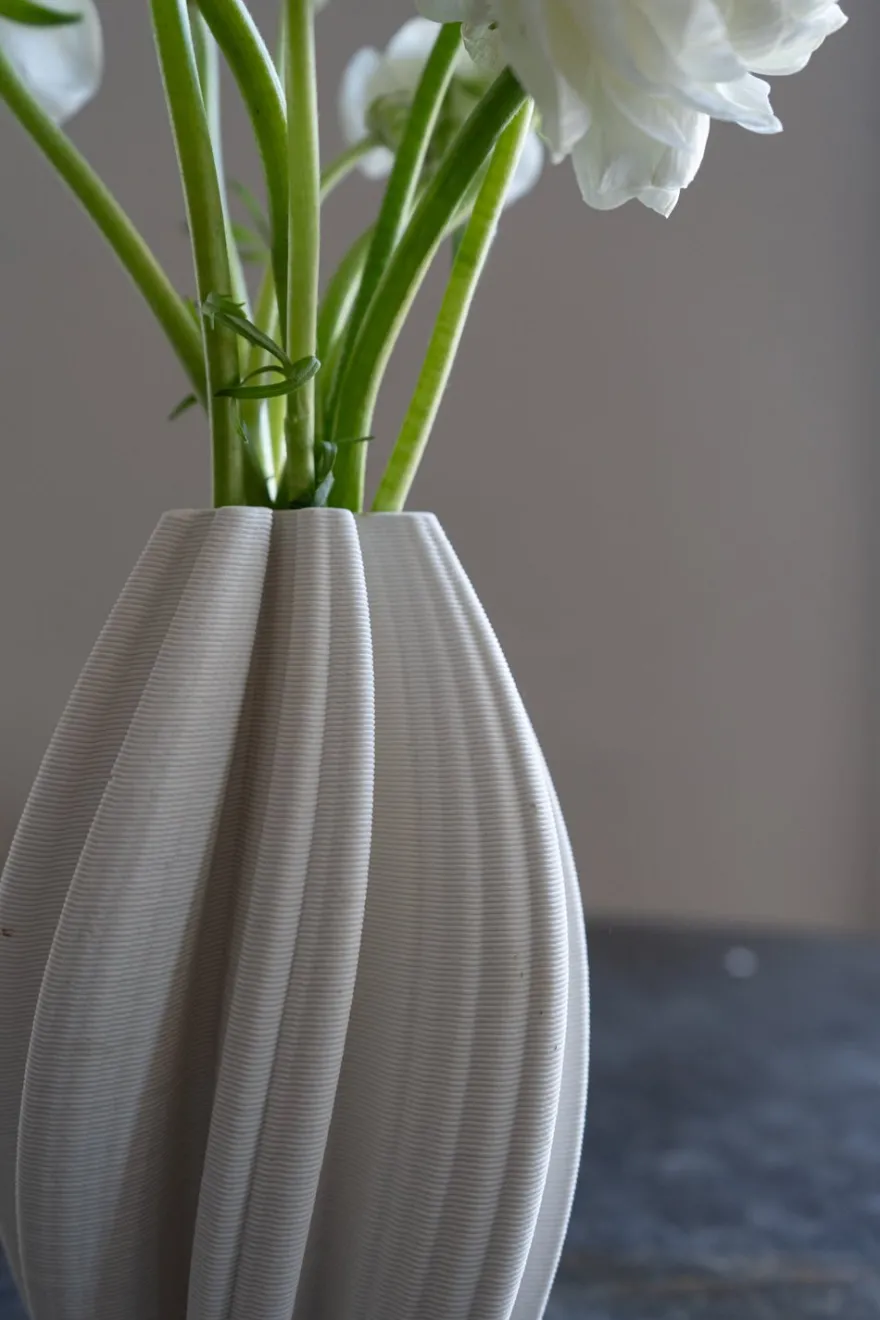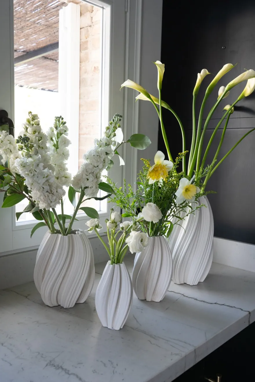 Jarrón de porcelana en color blanco, con un diseño irregular que aporta un toque de modernidad y estilo único a cualquier espacio. Presenta un efecto 3D que resalta su forma y textura, creando una pieza decorativa que juega con la luz y la profundidad. Perfecto para añadir un toque artístico a tu casa, ya sea para flores frescas o como pieza decorativa por sí sola.