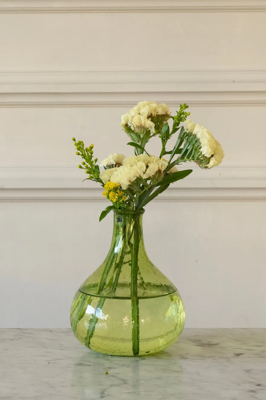 Jarrón o florero de cristal en color verde oliva bajo ovalado, ideal para decorar cualquier rincón de tu casa, tanto en interiores y exteriores, y en cualquier época del año.