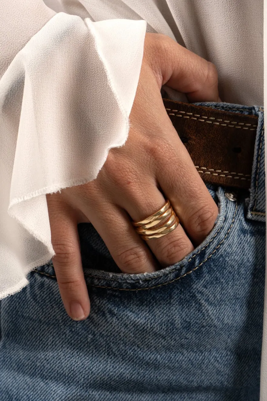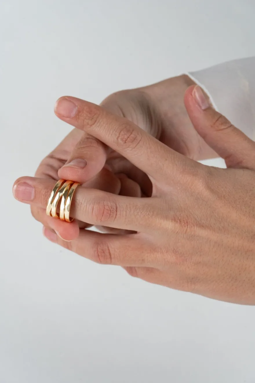 Anillo ajustable de latón bañado en oro para lograr un acabado brillante y duradero con diseño de cuatro argollas, ideal tanto para el día a día como para cualquier ocasión especial.