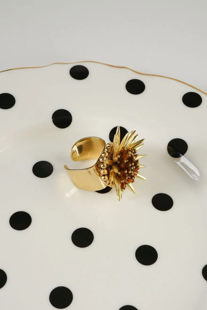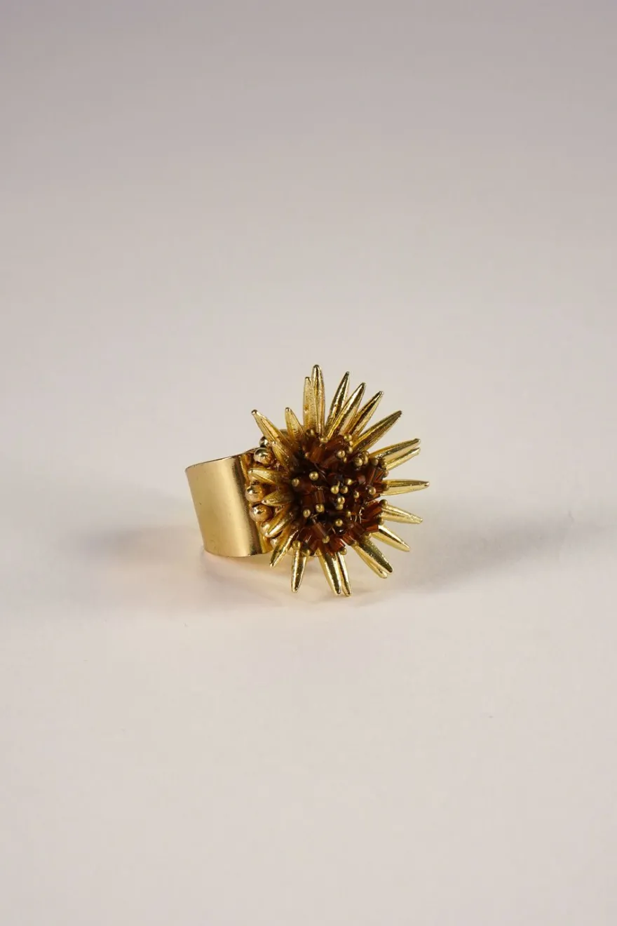 Anillo ajustable de latón bañado en oro para lograr un acabado brillante y duradero con diseño de girasol y cuentas marrones, ideal tanto para el día a día, como para cualquier ocasión especial.
