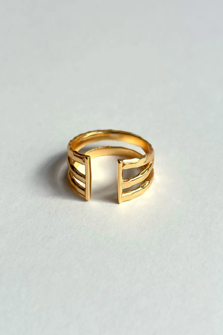 Anillo ajustable de latón bañado en oro para lograr un acabado brillante y duradero con diseño de tres argollas, ideal tanto para el día a día como para cualquier ocasión especial.