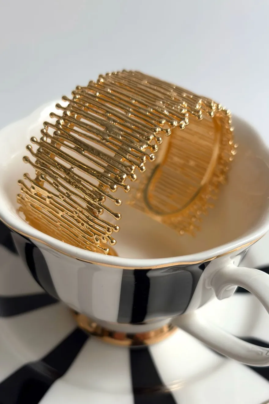 Brazalete ajustable de latón bañado en oro para lograr un acabado brillante y duradero con diseño irregular, ideal tanto para el día a día como para cualquier ocasión especial.
