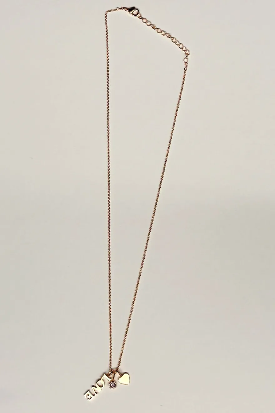 Collar de latón bañado en oro para lograr un acabado brillante y duradero con triple colgante de la palabra Love, un pequeño corazón y un delicado detalle brillante que aporta luz a la pieza. Un diseño actual y versátil, pensado para llevar a diario o como detalle especial, que combina sencillez y significado en una sola joya.