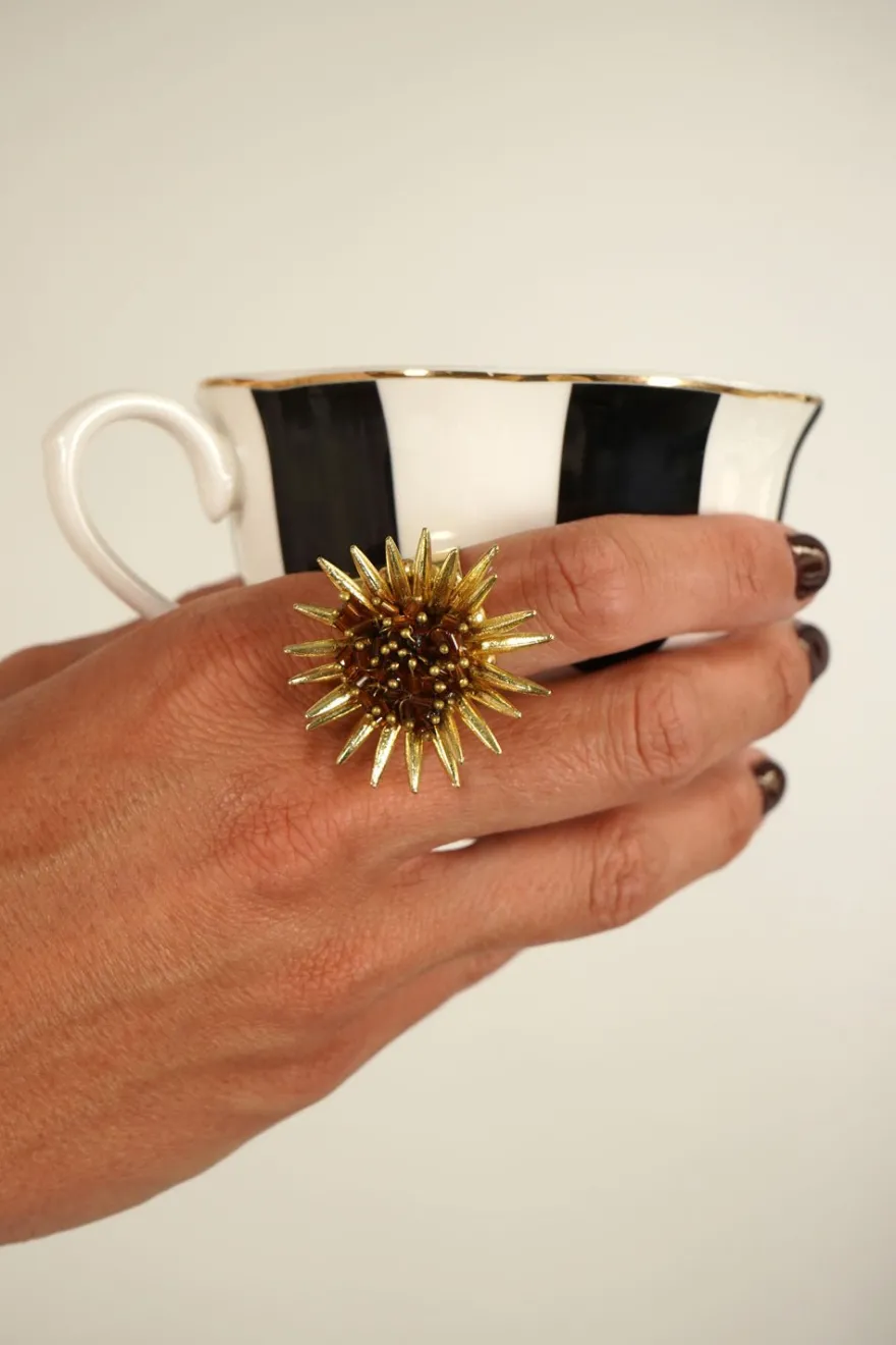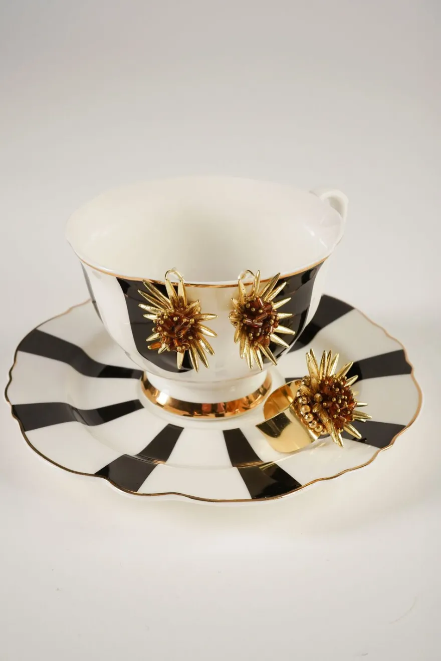 Combinación de anillo y pendientes de latón bañados en oro para lograr un acabado brillante y duradero con diseño de girasoles y cuentas marrones, ideal tanto para su uso diario como para cualquier ocasión especial.