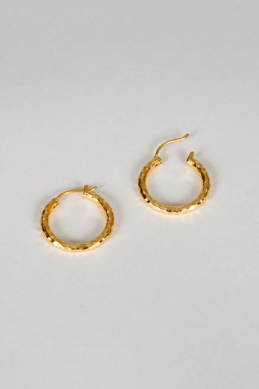 Pendientes de latón bañados en oro para lograr un acabado brillante y duradero con diseño de aros con efecto martillado, que aportan un toque de brillo y elegancia a cualquier look. Ideales tanto para el día a día como para cualquier ocasión especial.