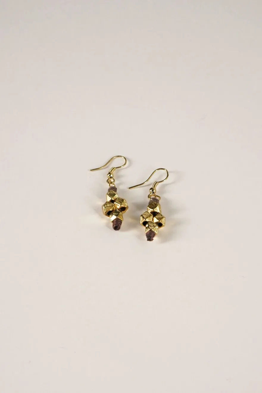 Pendientes de latón bañados en oro para lograr un acabado brillante y duradero con diseño de bolitas combinadas con hilo marrón, ideales tanto para el día a día, como para cualquier ocasión especial.